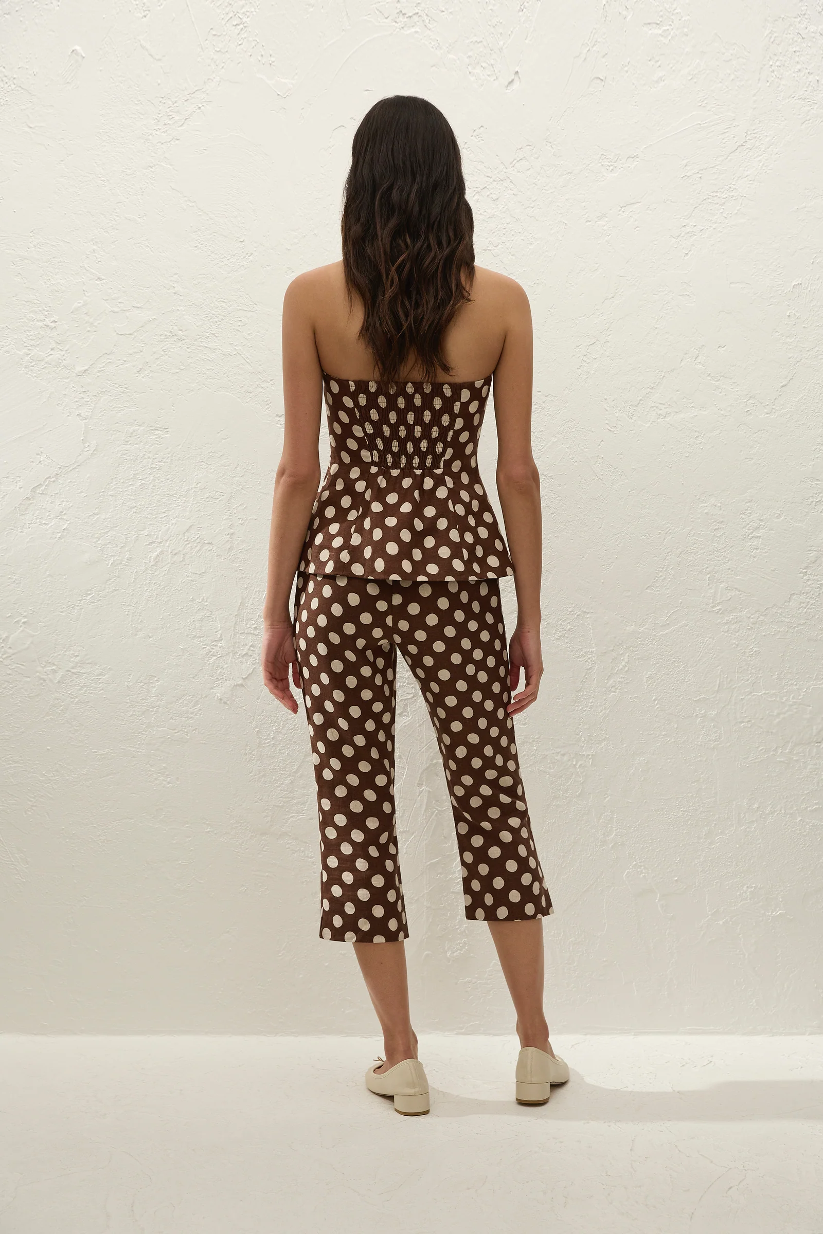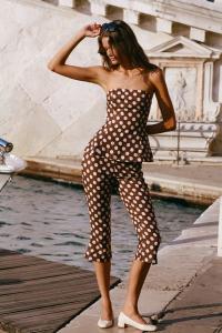 "Petro Top" fra Faithfull The Brand. En stroppeløs topp laget i 100 % European Flax®-lin, med et vintageinspirert prikkemønster i sjokoladebrunt. Den er figurnær over bysten, og fra midjen faller den ut i en peplumkant som avsluttes rundt hoftene. Styles gjerne med den matchende Valeria Capri Pant for et nostalgisk og gjennomført sett.