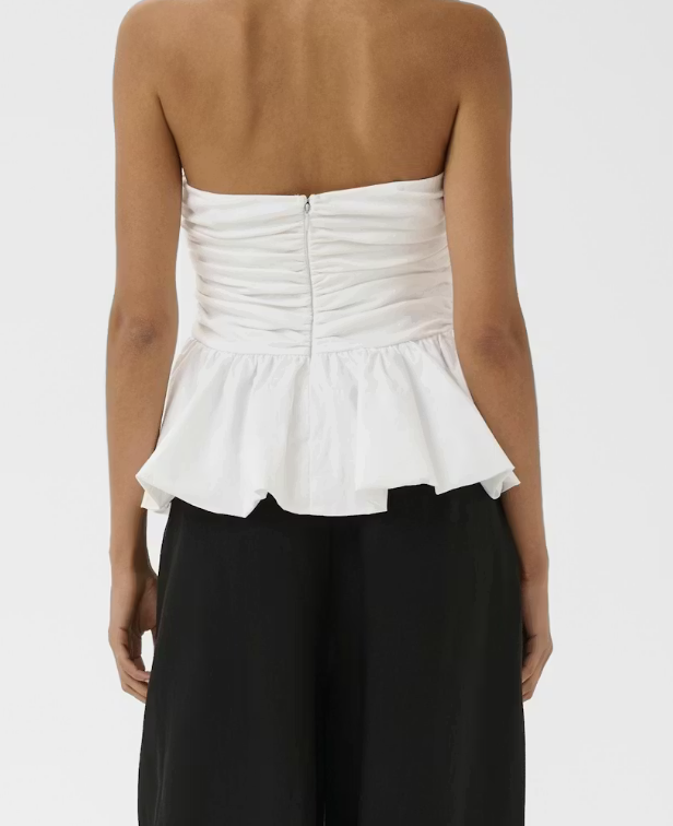 "Erin Top" fra Gestuz. Strukturert topp med rynket liv og vid peplumkant. Smale, avtakbare skulderstropper gir fleksibilitet. Tettsittende silhuett, rett utringning. Super kule til jeans!