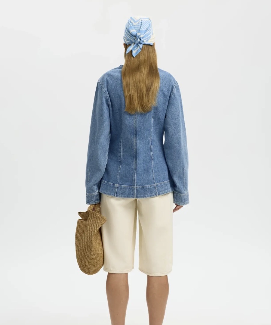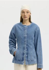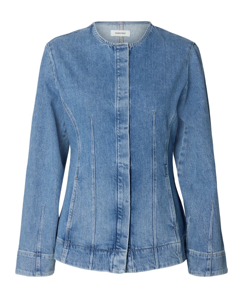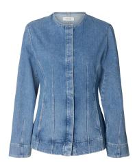 "Regular Merle - Kori Denim Jacket" fra Selected Femme er en denim jakke med skjult knappelukking forran. Jakken har innsvinget midje og rund hals.