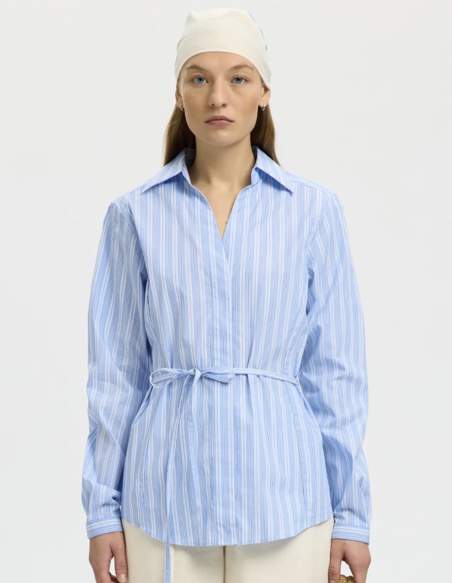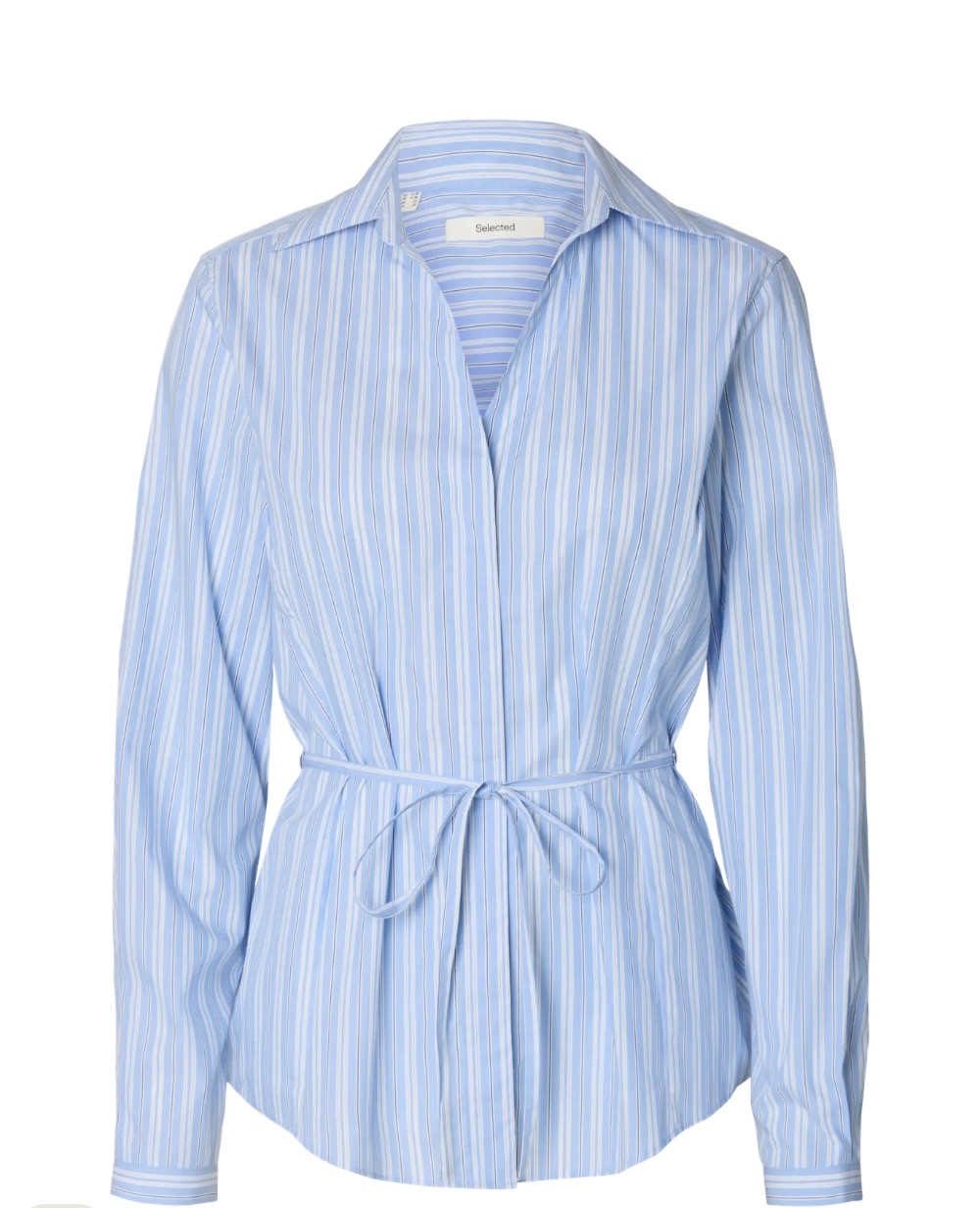 "Helga Regular Tie Shirt" fra Selected Femme. Klassisk poplin skjorte med avtagbart belte i midjen. Skjorten har klassisk skjorte krage med v-hals.