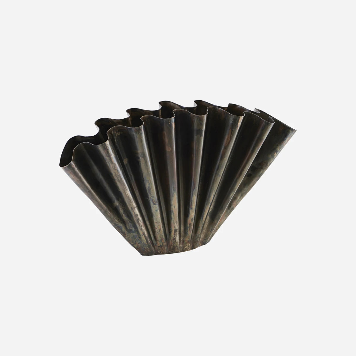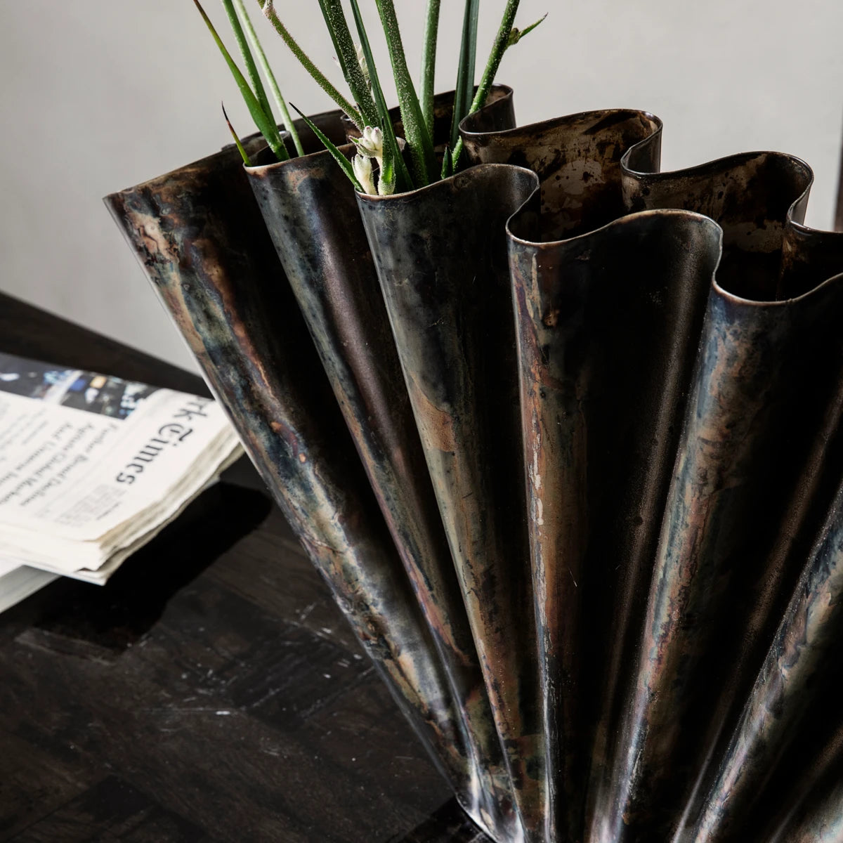 nnred hjemmet med vakre vaser som gir et særpreg til interiøret og fanger oppmerksomheten. Denne fine vasen fra House Doctor vil være et perfekt tilskudd til ethvert hjem, uansett eksisterende interiørstil. Vasen, Flood, er laget av jern, noe som gir den et industrielt og rustikt uttrykk med sin metalliske farge. Den unike vasen har folder på hver side som gir den et dynamisk preg. De små foldene bidrar også til å holde blomstene på plass, slik at de ikke faller ut til sidene.
