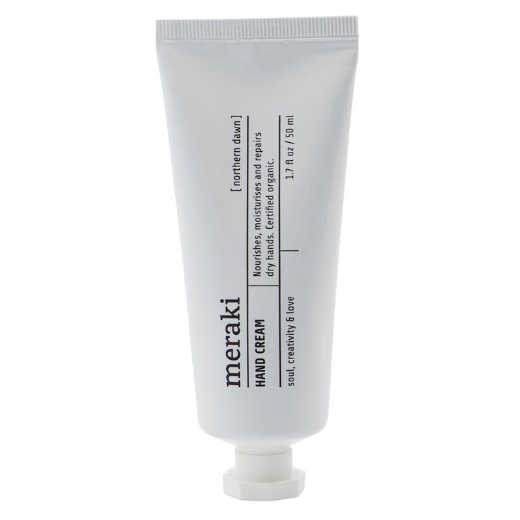 Hand Cream Northern Dawn er en økologisk sertifisert håndkrem med økologisk aloe vera, mandelolje og kakaosmør som nærer, fukter og bløtgjør hendene uten at de føles fete. Håndkremen, Northern Dawn fra Meraki, har en herlig duft som passer for daglig bruk og til alle hudtyper. Så trenger hendene ekstra fuktighet og pleie er denne håndkremen et godt valg. Den praktiske størrelsen gjør det også perfekt for reiser.