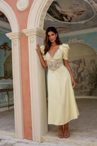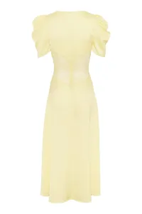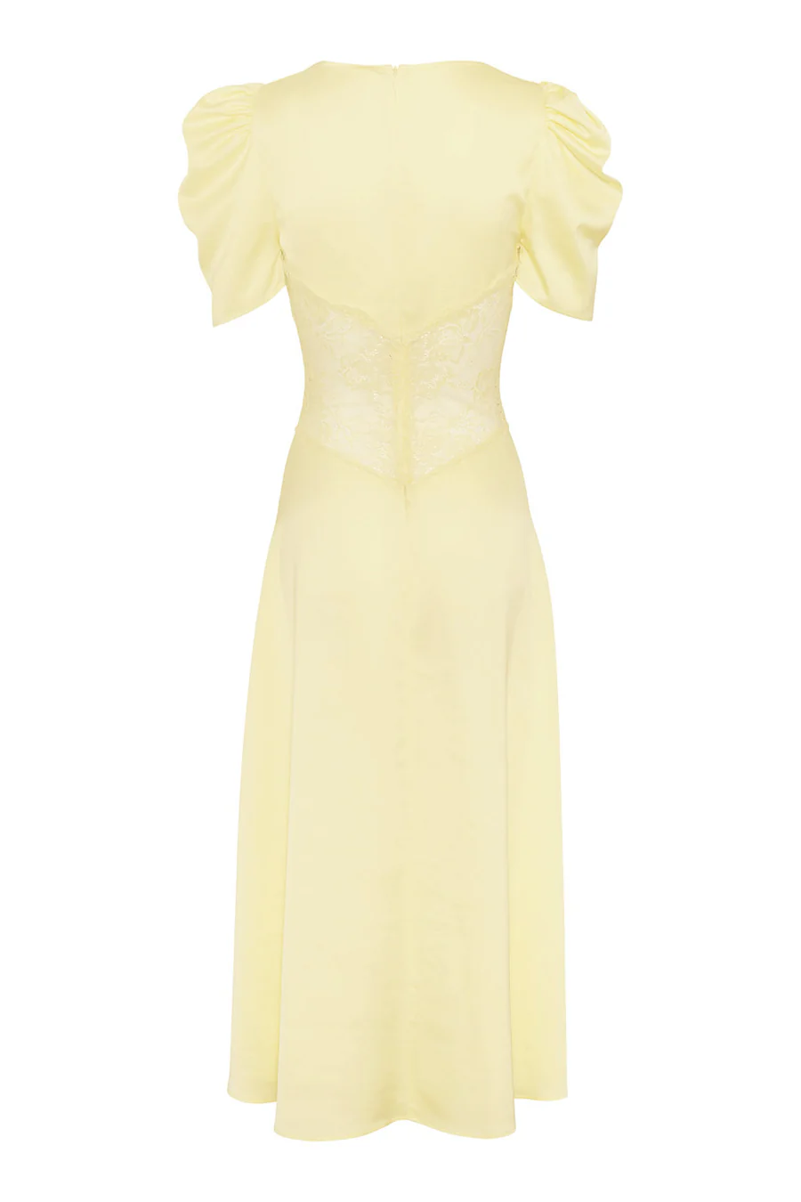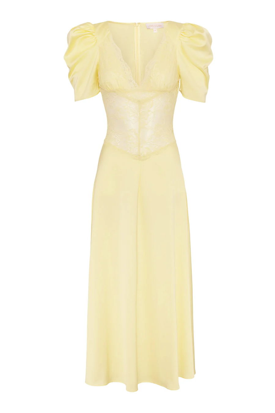 "Francis Lace Midi Dress" fra LoveLolina. Denne løfter sommer garderoben til nye høyder. Kjolen er gjennomsiktig i midjen og har puffede ermer med skulderputer. Den har en dyp v-hals og a-formet silhuettskjørt. Kombineres med et par elegante siletter for et komplett antrekk!