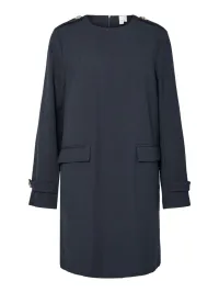 Nydelig kjole med med rund hals og lang erm. Klaff lommer foran.