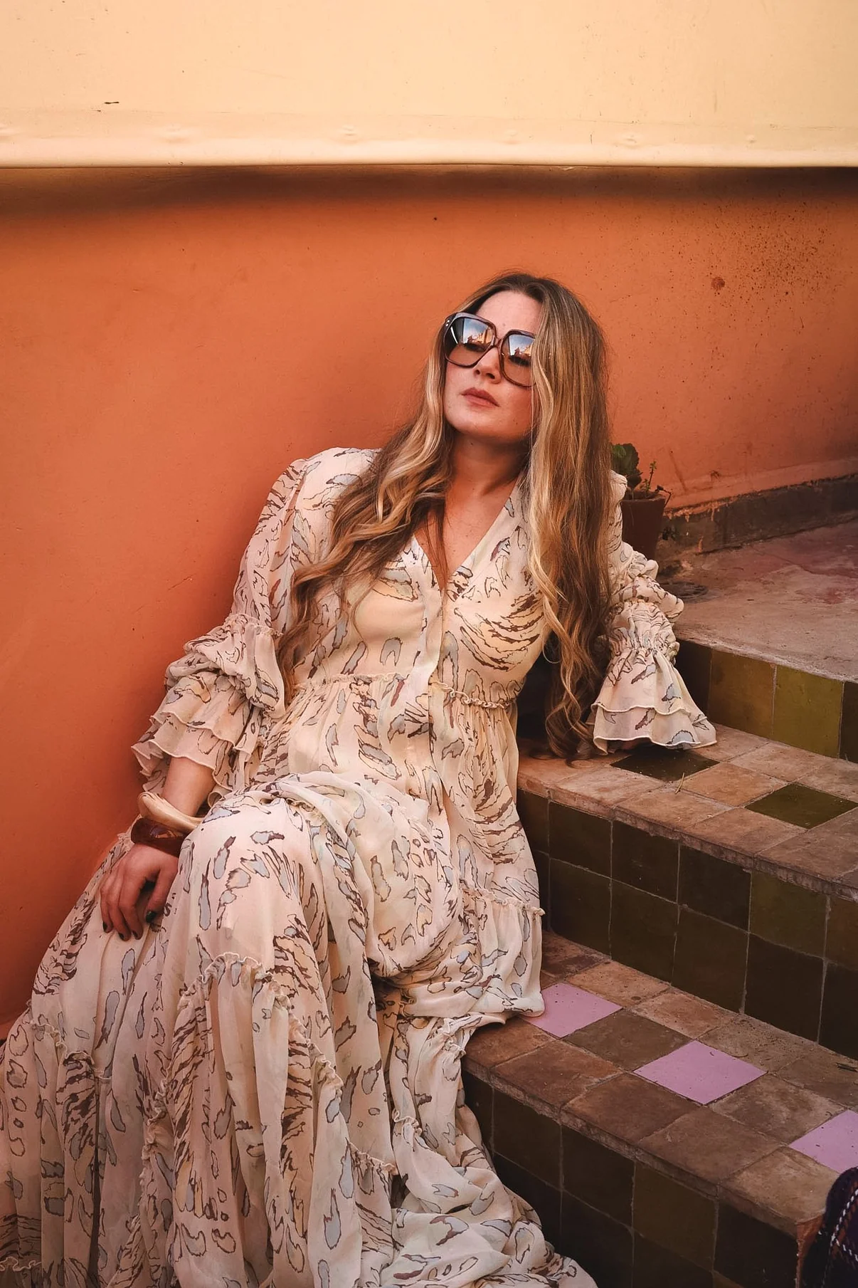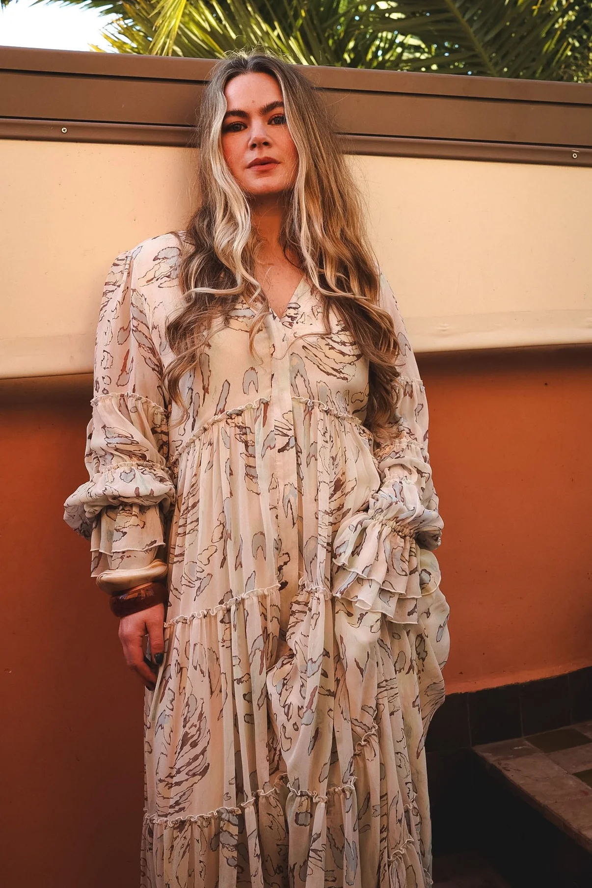 Vakker lang kjole i nydelig print med volum, rysjer og en avslappet A-formet silhuett. Avsluttet med skjulte lommer og heldekkende knapper foran, bruk den lukket eller åpen som en kimono.