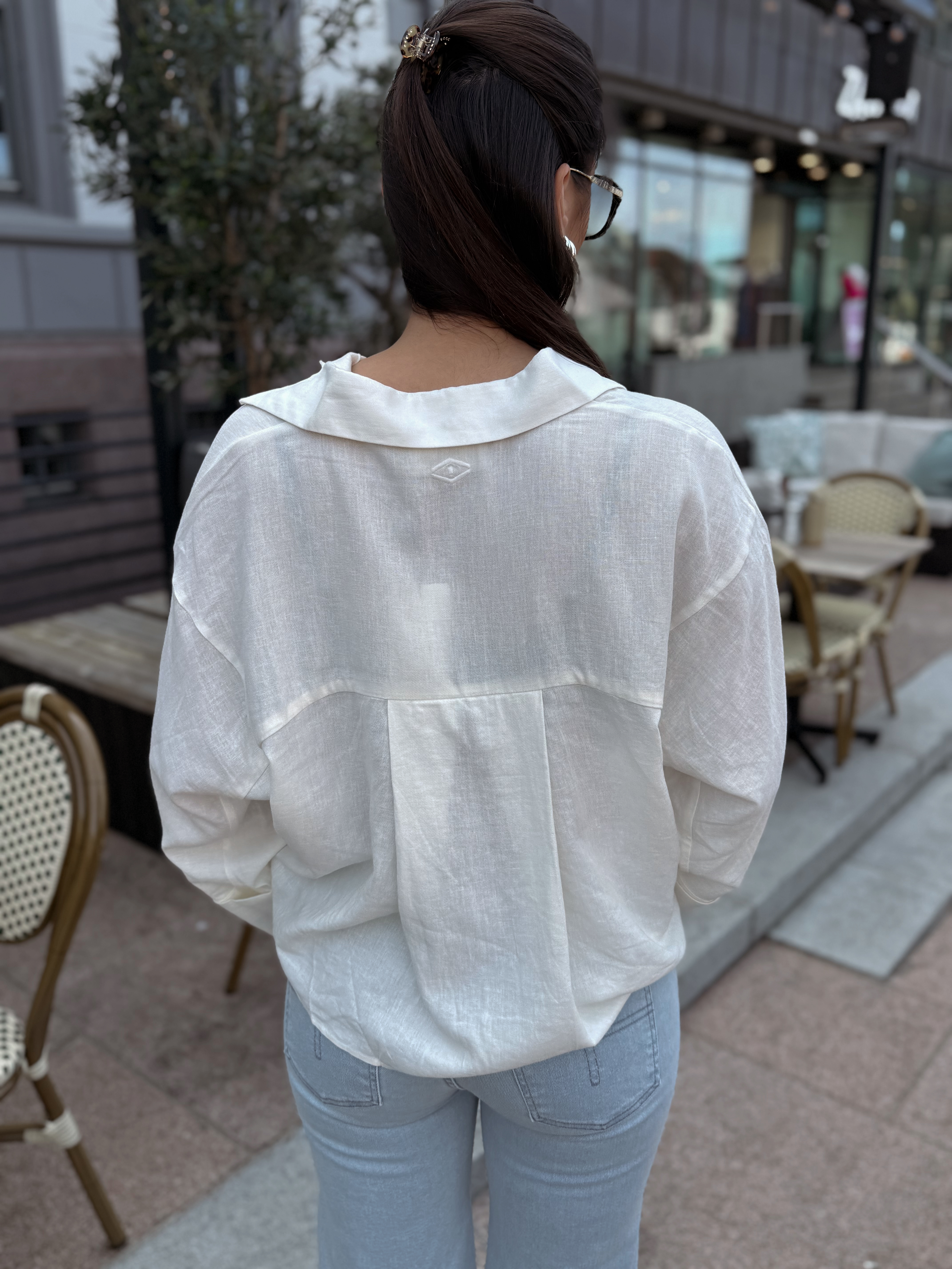 Et signaturstykke fra Iben, Atari-skjorten er nå gjenskapt for den varmere årstiden. Laget av en høykvalitets lin-viskoseblanding, noe som gir en pustende, lett følelse med en forhøyet drapering. Den overdimensjonerte silhuetten, brede mansjettene og den subtilt beskårne lengden gjør den til et dristig, men allsidig statement-plagg for enhver anledning.