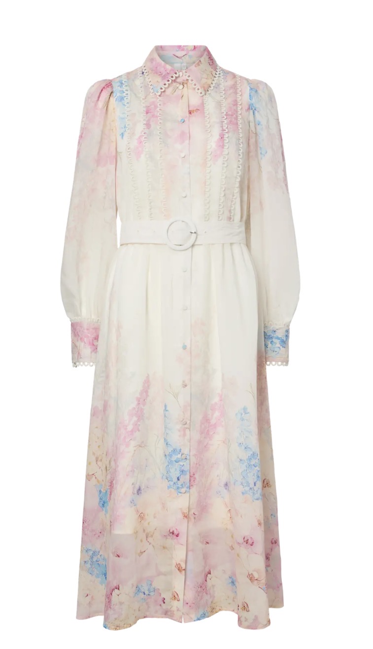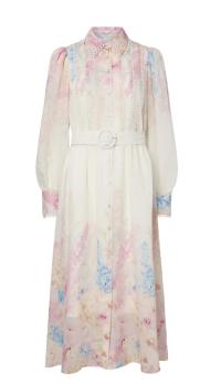 "Florence Long Dress" fra Yas. Lang kjole med blomsterprint i pastellnyanser av rosa og blå på en kremhvit base. Kjolen har lange ermer og et belte i midjen.