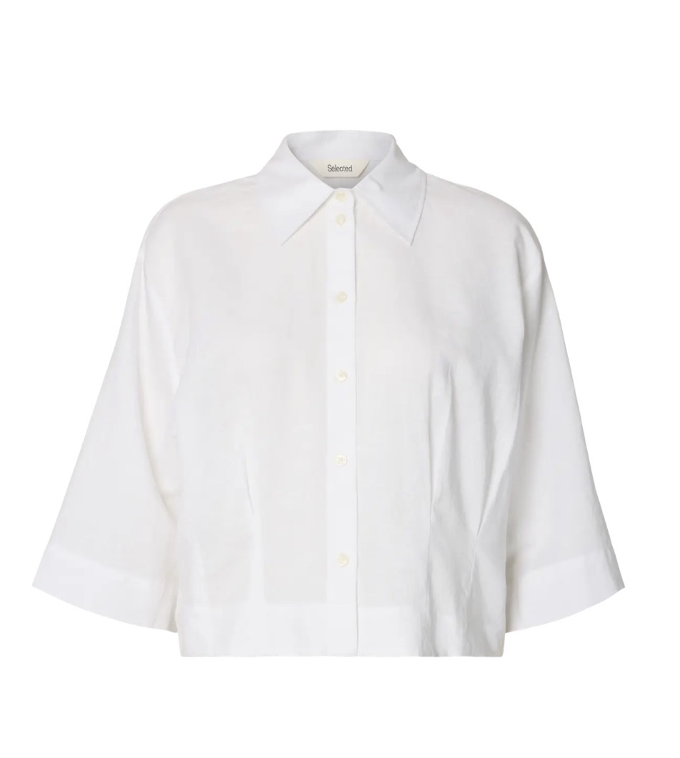 "Cleo Regular 3/4 Cropped Shirt" fra Selected Femme. Super kul skjorte i en cropped fasong. Skjorten er innsvinget i midjen og med vide 3/4 ermer.