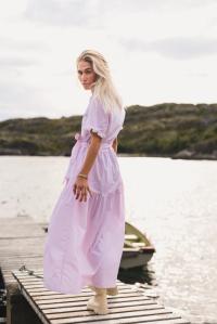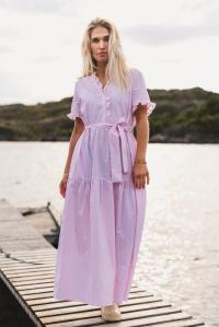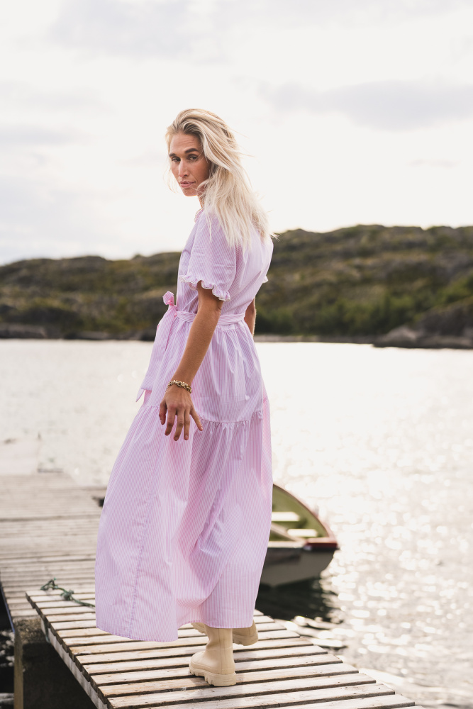"Ida Maja 2/4 Shirt Dress" fra RAUS er en herlig sommerkjole, perfekt for varme dager! Kjolen er laget i lett og luftig bomull som føles myk og behagelig på huden. Den offwhite bunnfargen med grønne striper gir et friskt og elegant uttrykk, og gjør kjolen enkel å style til både hverdag og mer pyntede anledninger. Ida Maja har V-hals med søte volanger, korte ermer med volangdetalj og en knappestolpe på brystet som gir et klassisk og tidløst preg. Knytebåndet i midjen lar deg justere passformen etter ønske, og den avslappede silhuetten med lengde til midt på leggen gjør kjolen både komfortabel og flatterende.