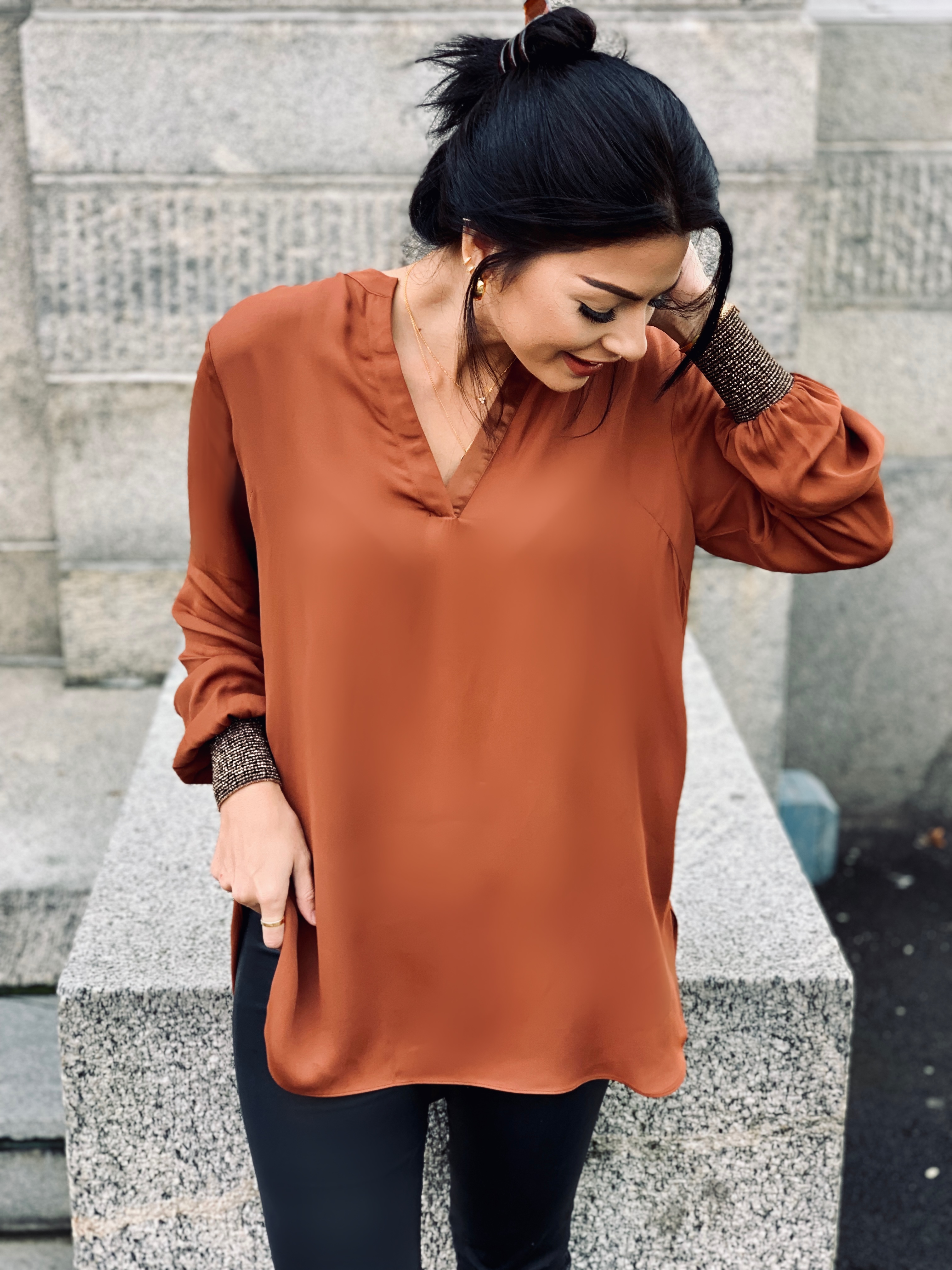 Blusen er lang i modellen og med metallisk vrangbord nederst på ermene. Romslig/casual fit. Den har V-utringning med silkekant rundt. Tung viskosekvalitet som faller veldig fint. Den er lengre bak enn foran og med splitt i sidene.