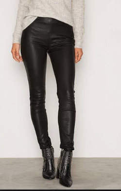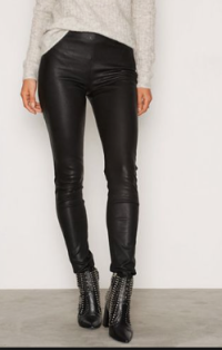 "Sylvia Stretch Leather Leggings" fra Selected Femme. Skinnleggings av ekte skinn med en fantastisk stretch. Buksen lukkes med glidelås og en knapp på siden. Smal strikk i midjen og ufoldet kant nederst på buksebena. Kan klippes nederst dersom man ønsker en kortere lengde.