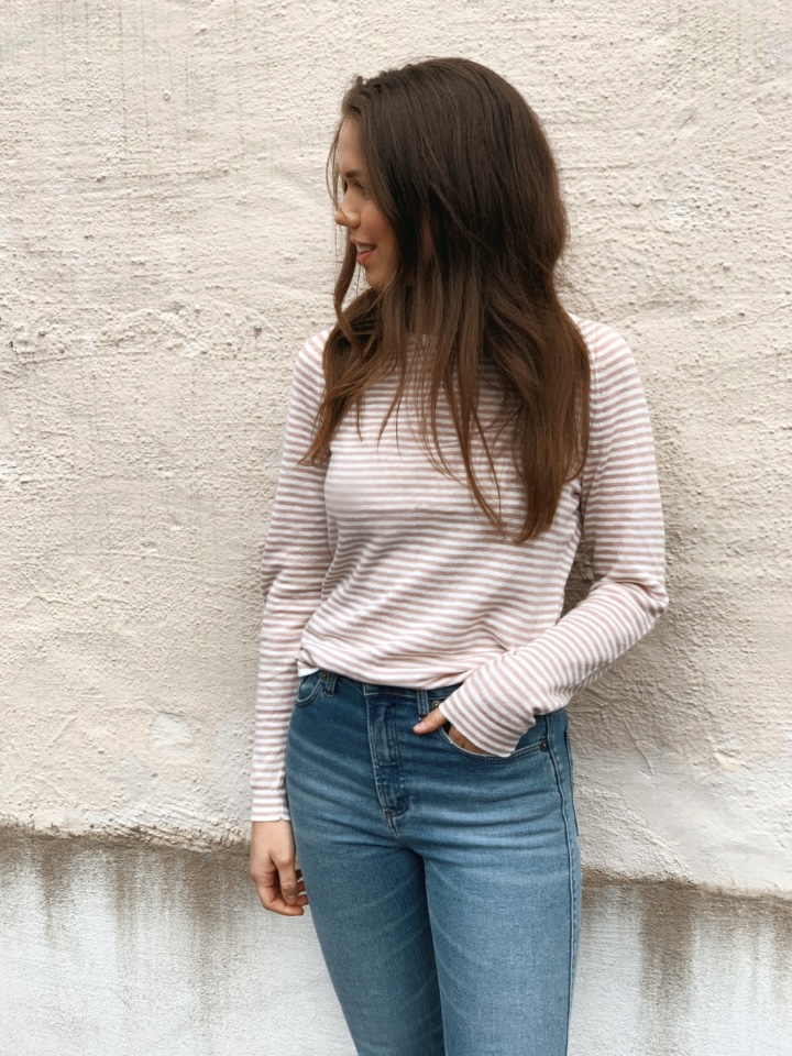 Er en nydelig tynn, lin-strikket genser, den har runde hals & rett, halvløs i modellen. Normar i størrelsen.