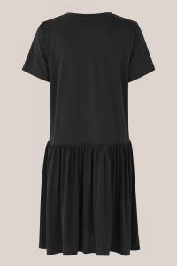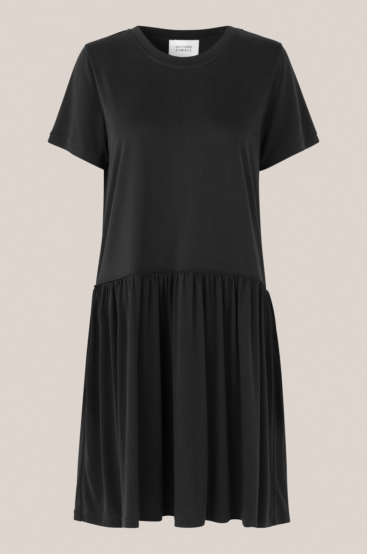 "Rayes Tee Dress" fra Second Female er en deilig T-skjortekjole som er laget av en nydelig og myk modal og polyester blanding. Kjolen har et sporty utseende med en rund halsringning, korte ermer fra T-skjorten og over hoftene har kjolen en avslutning med en søm med små legg for volum og bevegelse.