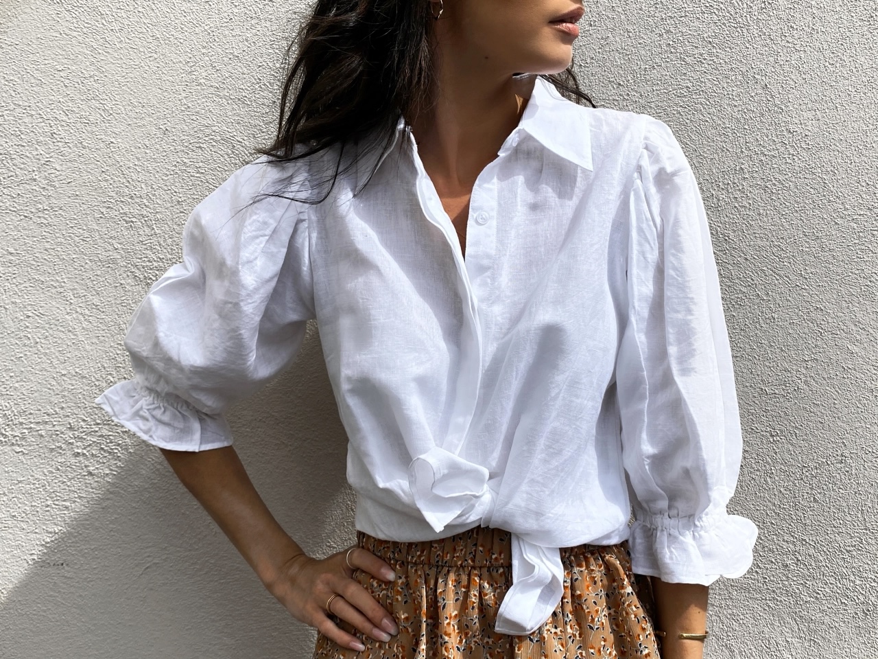 "Amy shirt" fra MISSMAYA er en nydellig luftig skjorte i linblanding. Skjorten har behagelig kvalitet. Tre kvart erm med lekre puffermer med strikk og rysjer nederst. Superfin å ha oppe i et skjørt eller jeans. Normal i størrelsen.
