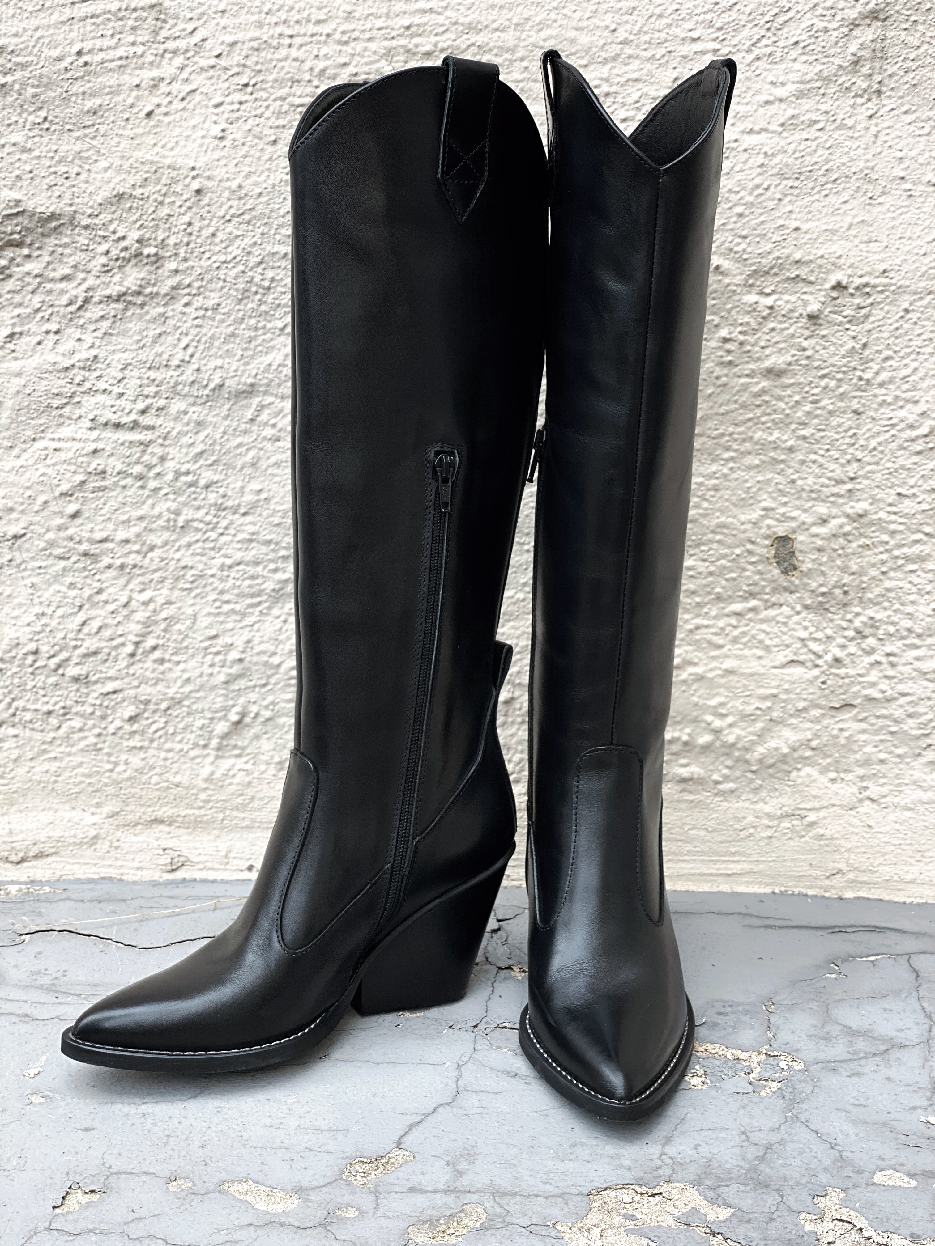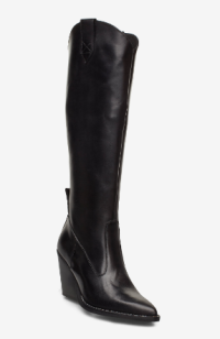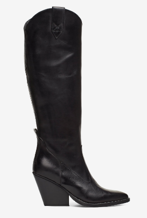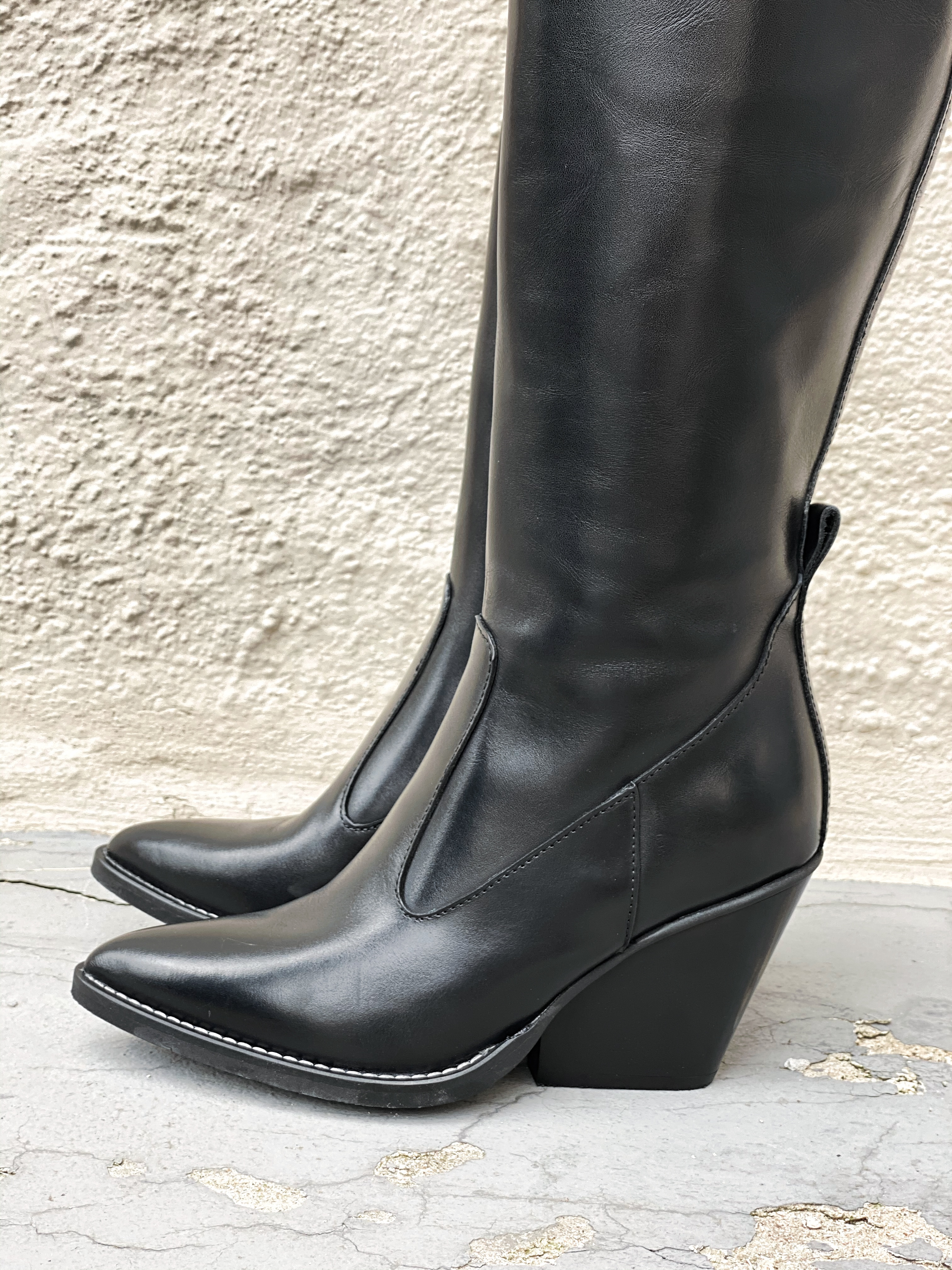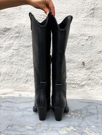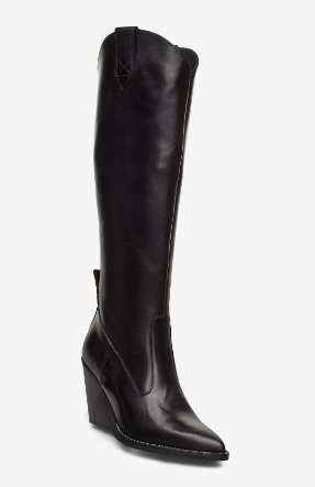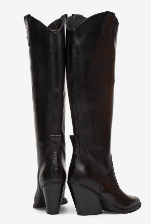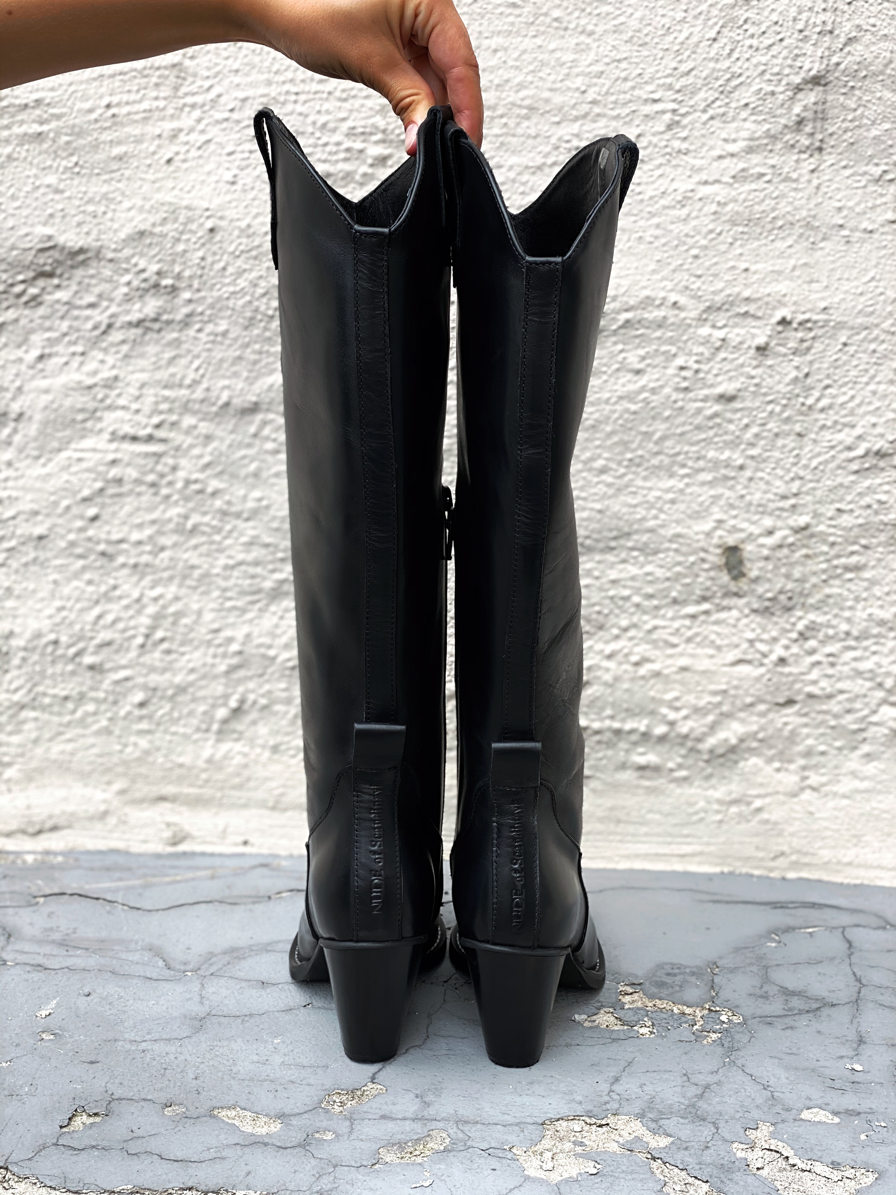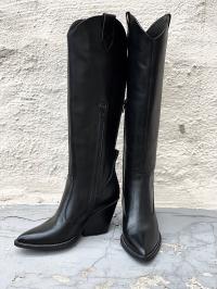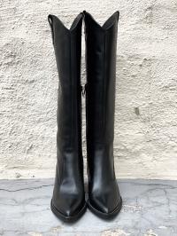 " Tequila nero støvletter " fra Nude of Scandinavia er trendy sorte skinnstøvletter. Den har kne høyde og spiss tupp på støvletten.
