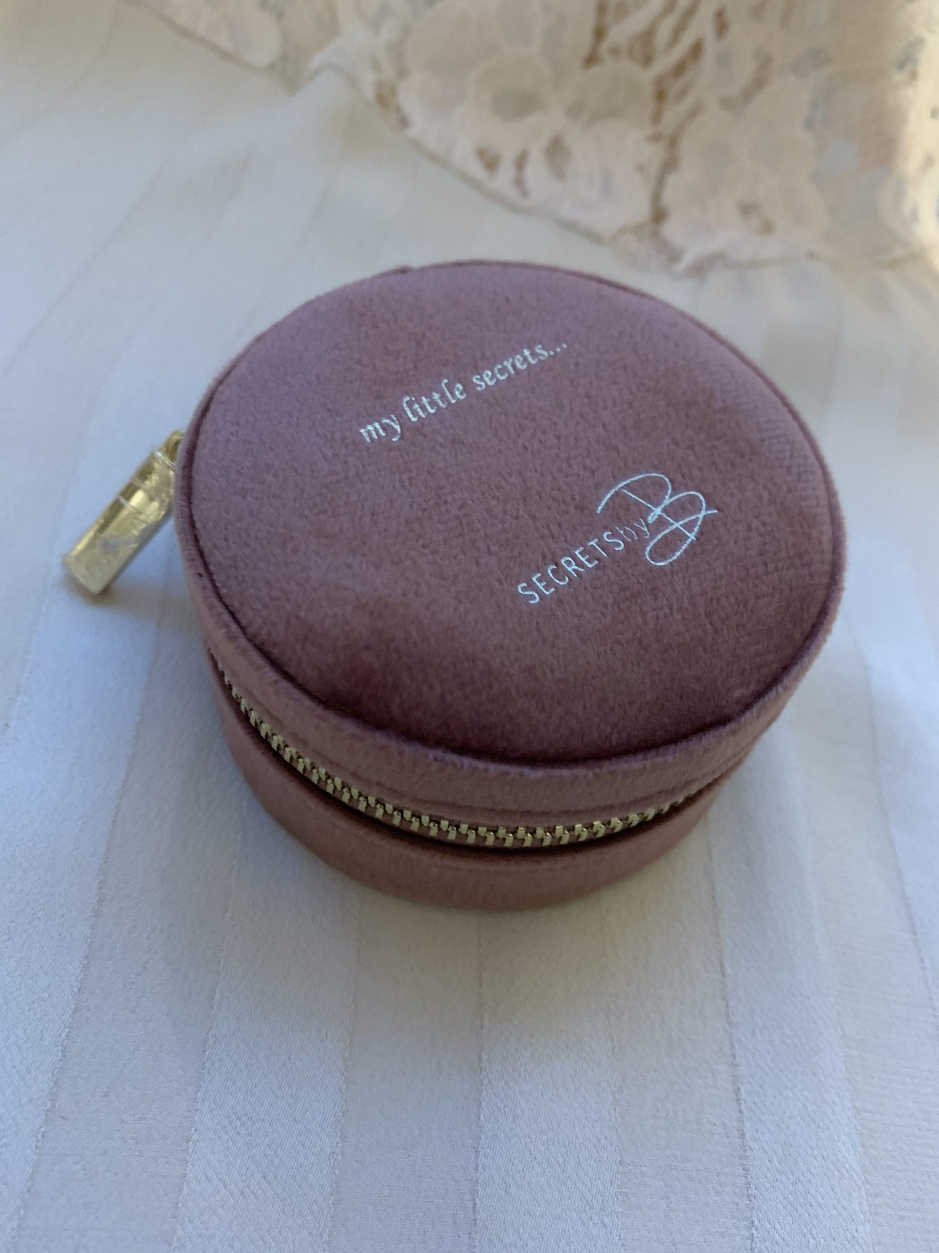 "My little secrets smykkeskrin" fra det norske merke Secrets By B. Praktisk og nydelig resisesmykkeskrin. Vakker farge med teksten “my little secret`s” i gull.