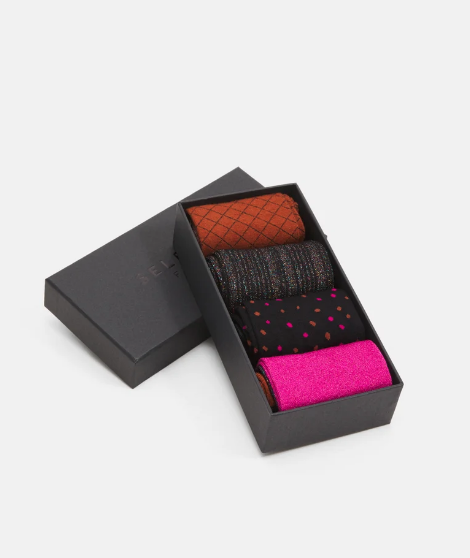 "Charlotte 4-pack sock" fra Selected Femme. Gaveboks til dame. 4 ulike sokker, laget av myk viskose og metalliske fibre. Standard/lang vristlengde. One Size.