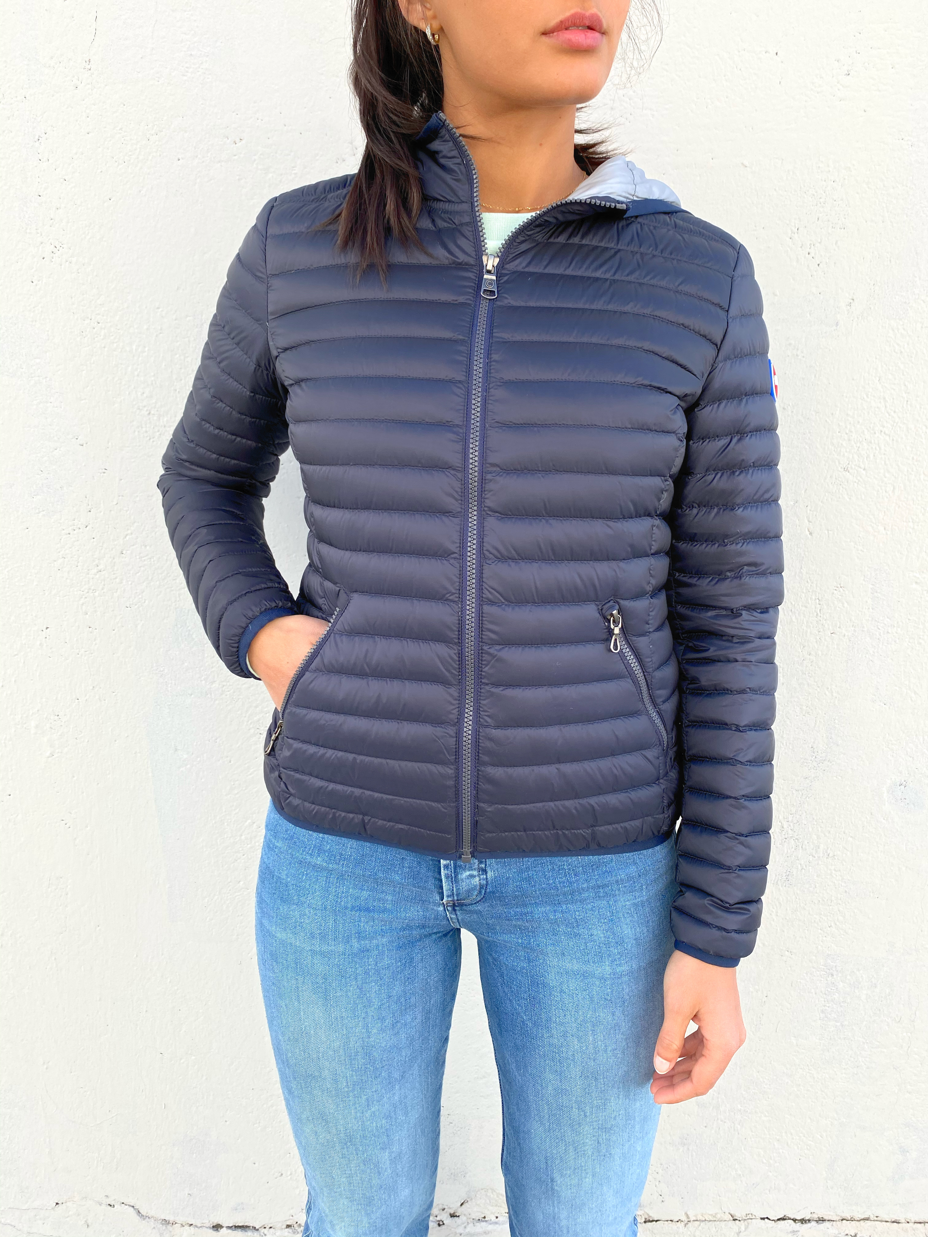 Superfin lettdunjakke fra italienske Colmar. Modellen er kort med strikk nederst og hette. Den er feminin i snittet med innvendig fôr i sølv. Colmars bestselger!