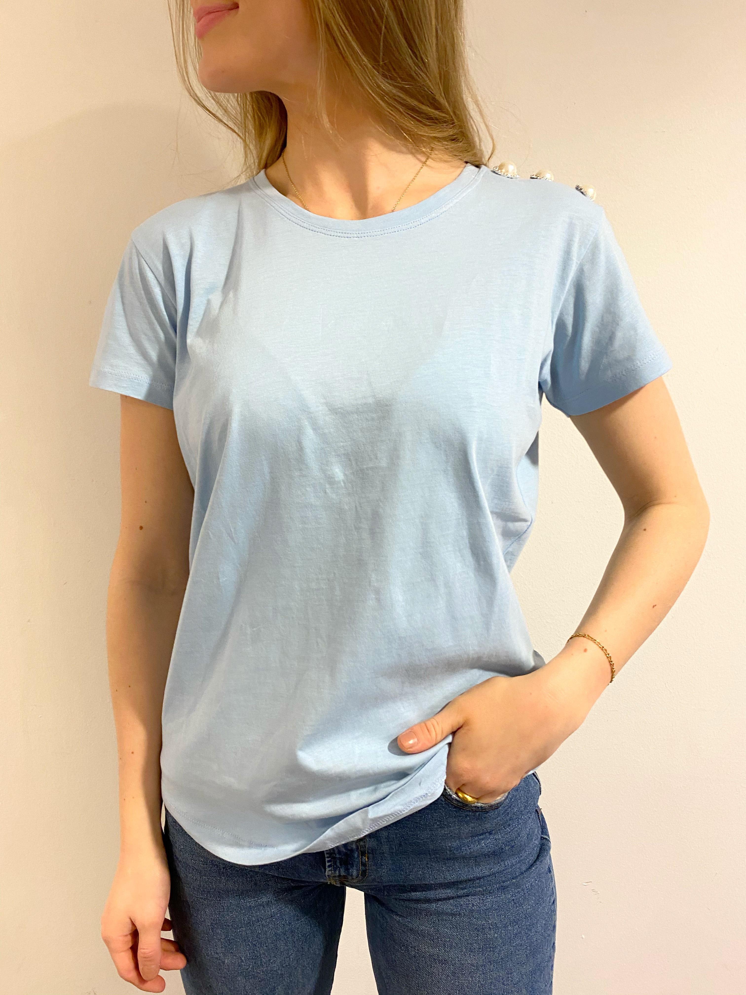 "Molly crystal" fra Custommade er en t-skjorte i økologisk bomull med krystallknapper på den ene siden på skulderen. T-skjorten har rund hals og kort erm. Normal i størrelsen.