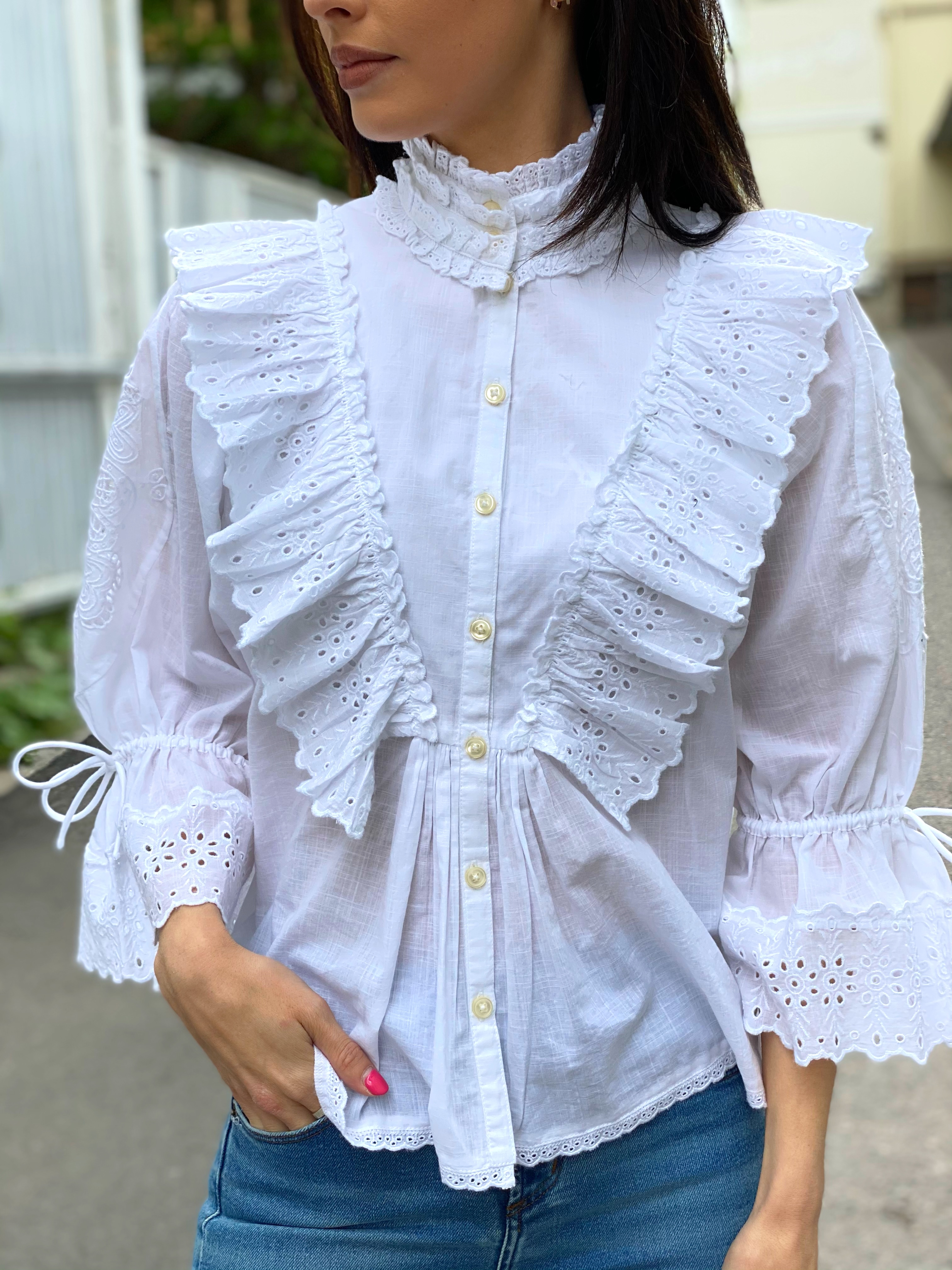 "Cotton Slub Frill Shirt" fra byTiMo. Bomullskjole med lekre blondedetaljer. Rund hals og halvlange ermer med snøring. Knepping foran.