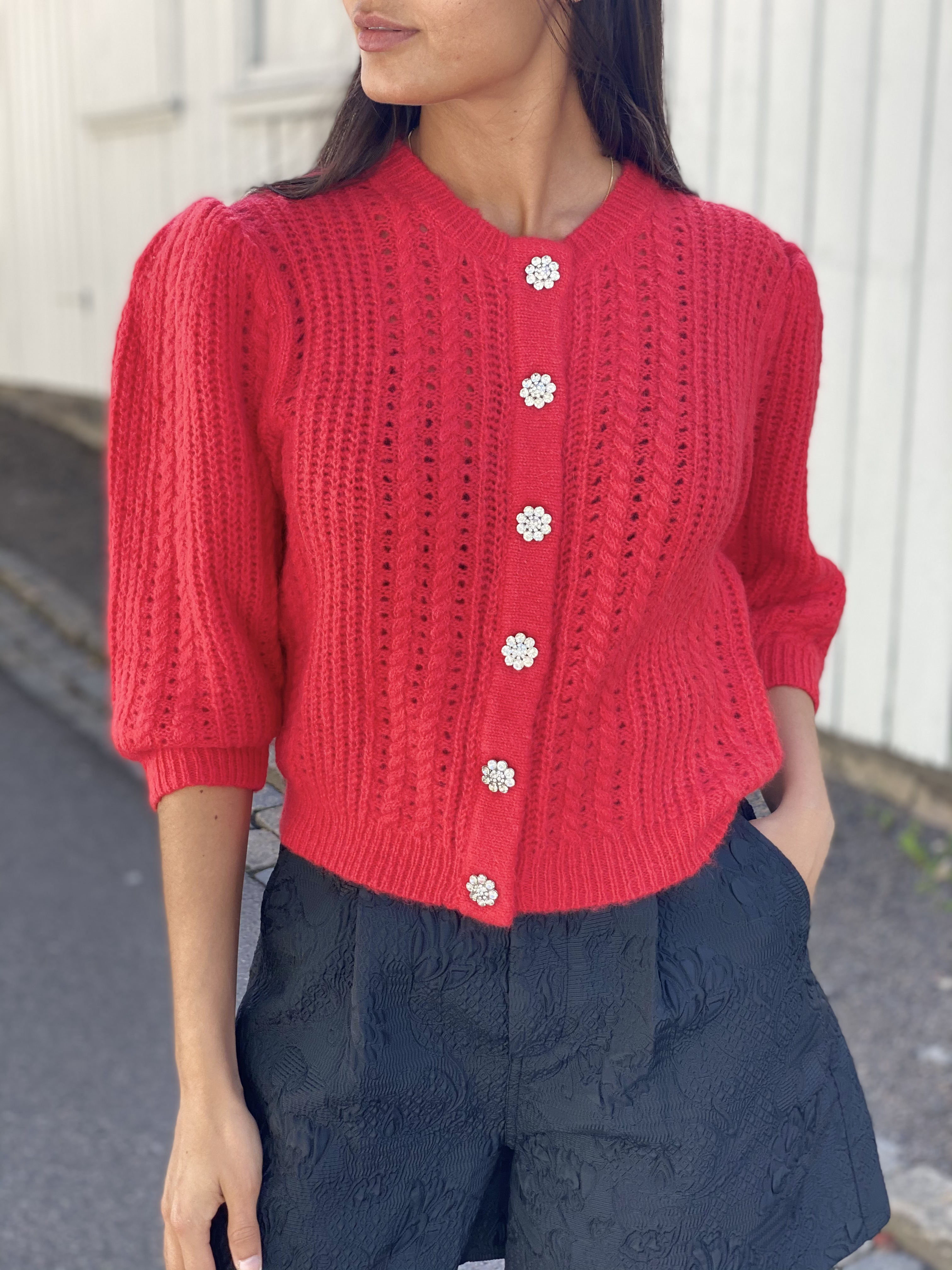 "Vilke" er en nydelig strikket cardigan i en alpakka- og ullblanding. Den har har rund hals, halvlange ermer og lukkes med vakre krystallknapper. Kort i modellen og normal i størrelsen.