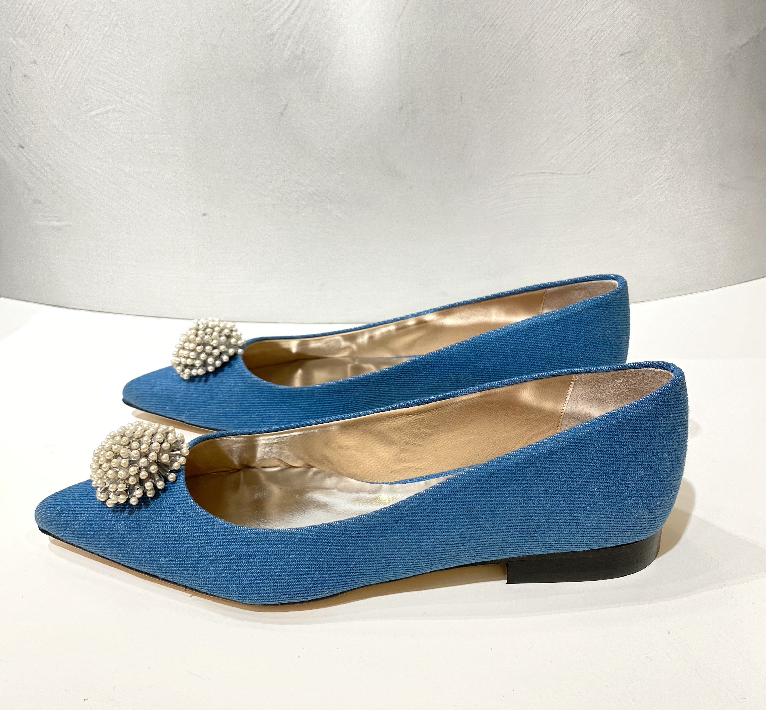 «Roselyn Pearl Bundle» fra CUSTOMMADE rålekre pensko med perledetaljer - som sesongens trend. Det er den perfekte festsko med et unikt design, behagelig stoff og en lav hæl.