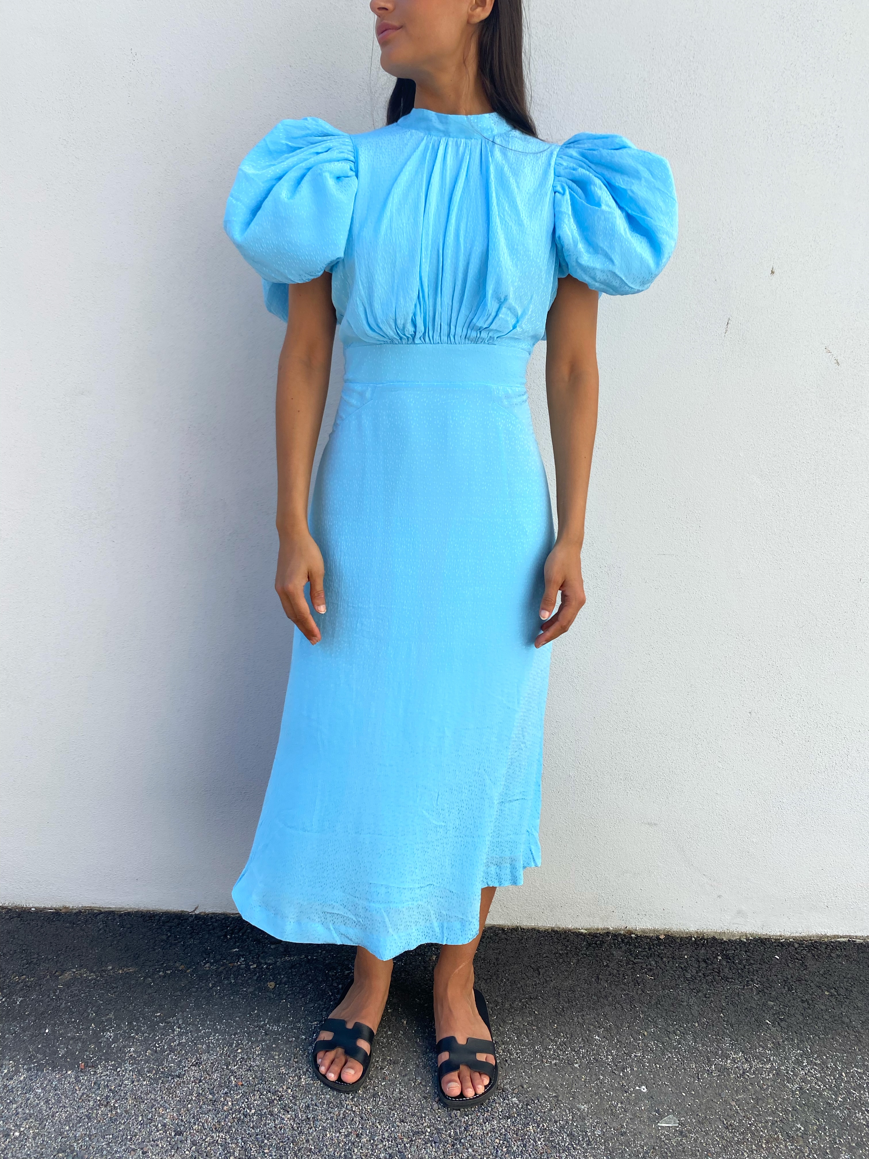 "Dawn dress" fra Rotate er en rålekker kjole som har en lang og elegant silhuett med store voluminøse ermer, åpen rygg med bånd og et skjørt med bredde. Kjolen er laget av et lett materiale som faller vakkert.
