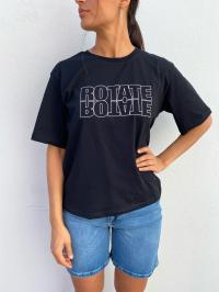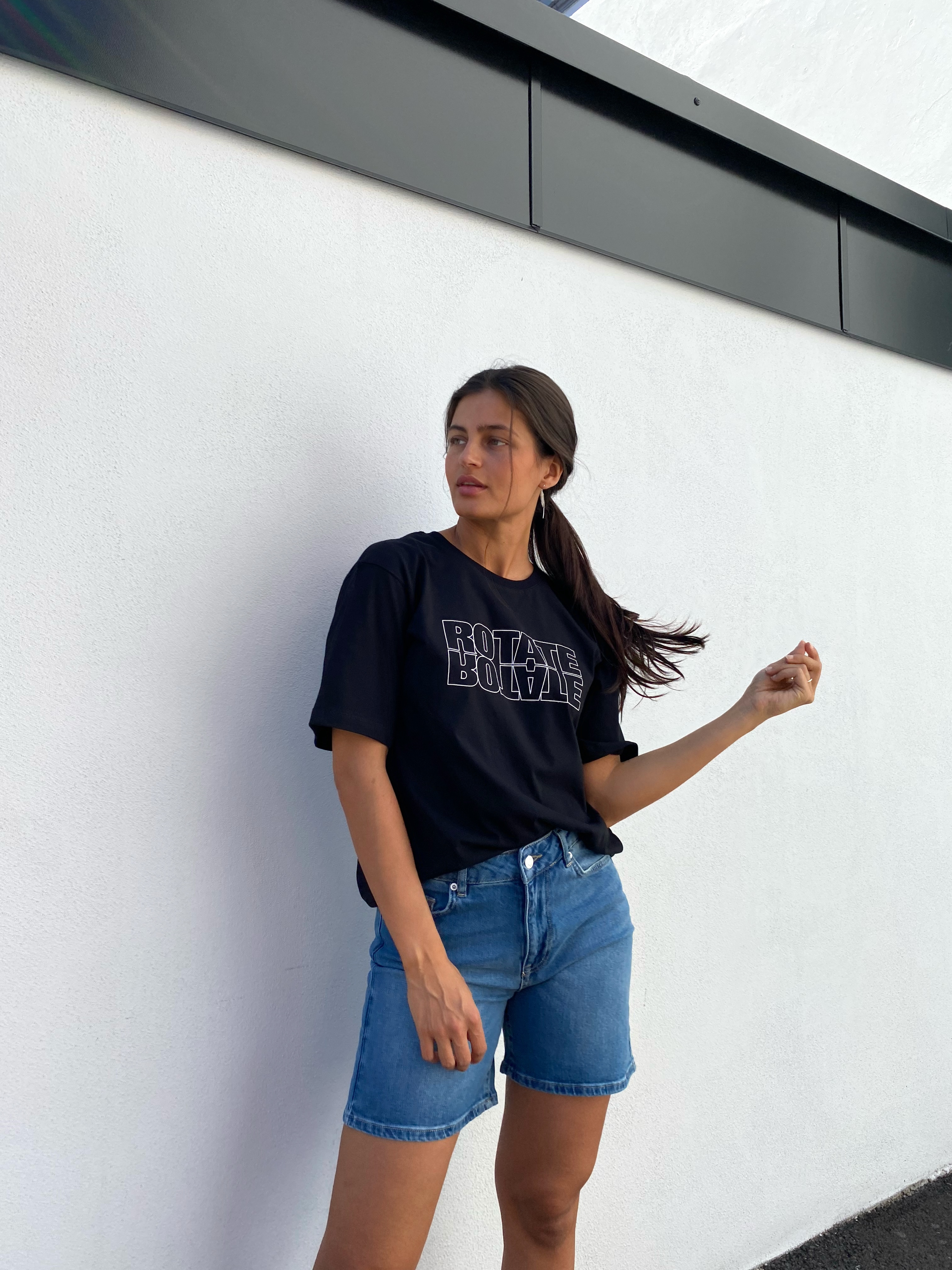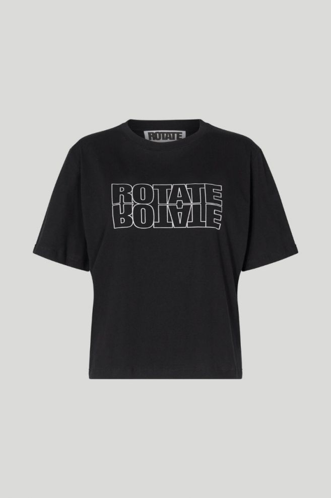 "Aster t-shirt" fra ROTATE er en t-skjorte som er laget av 100% økologisk bomull. Den har en overdimensjonert silhuett med korte ermer, ribbet halsringning og ROTATE trykt foran. Normal i størrelsen.