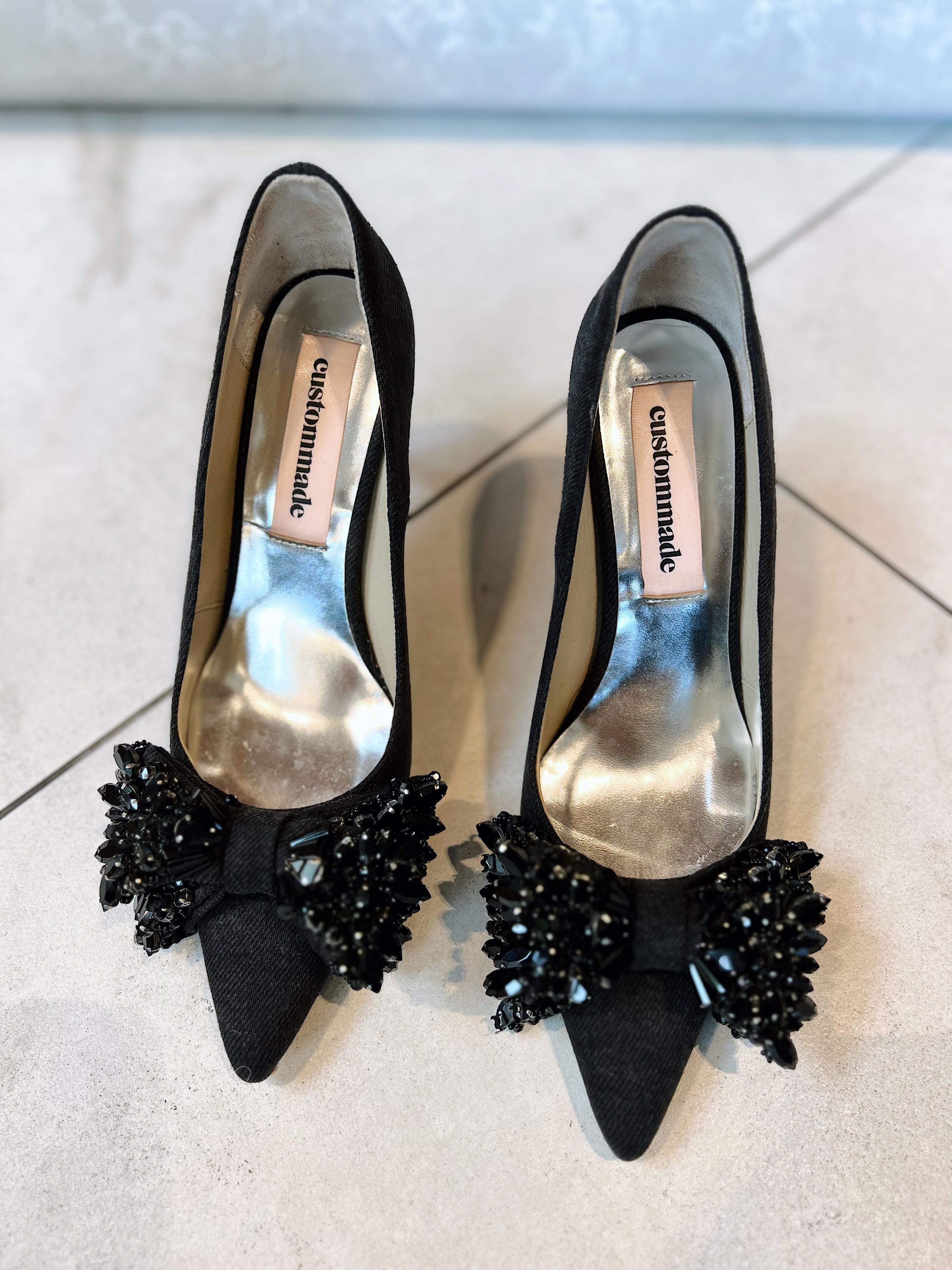 «Aljo denim crystal» fra Custommade er rålekre pumps med den mest eksklusive krystallbuen og i et sofistikert denimmateriale er det den perfekte festskoen med et unikt design. Med sin 8,5 cm høye hæl har den en behagelig passform. Håndlaget i Portugal.