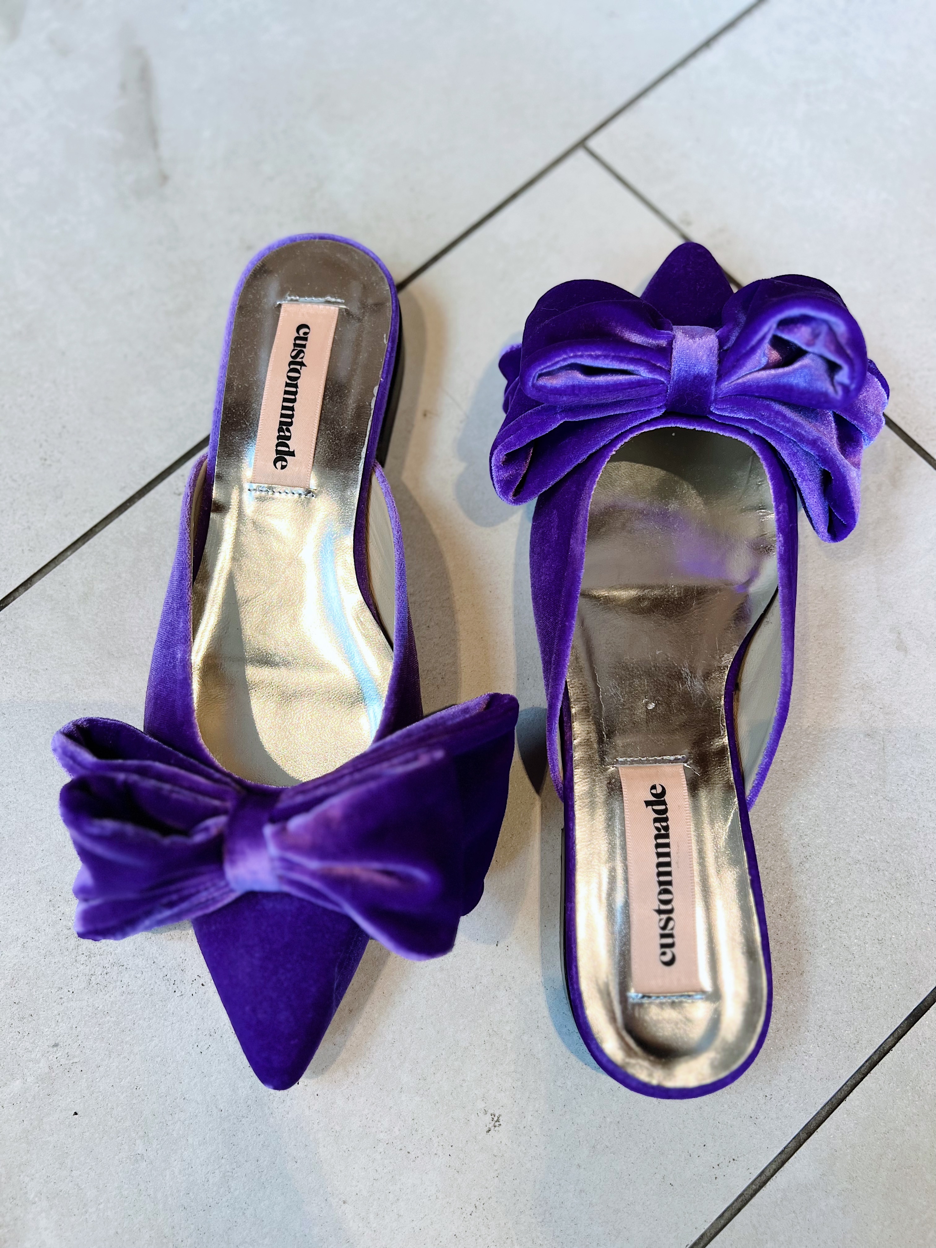 «Marbel velvet» fra Custommade er en flat versjon av «Marita velvet». Skoen har en "fløyel"-følelse og en sløyfe foran. Den har lukket tå og åpen rygg. Den er litt liten i størrelsen. Håndlaget i Portugal.