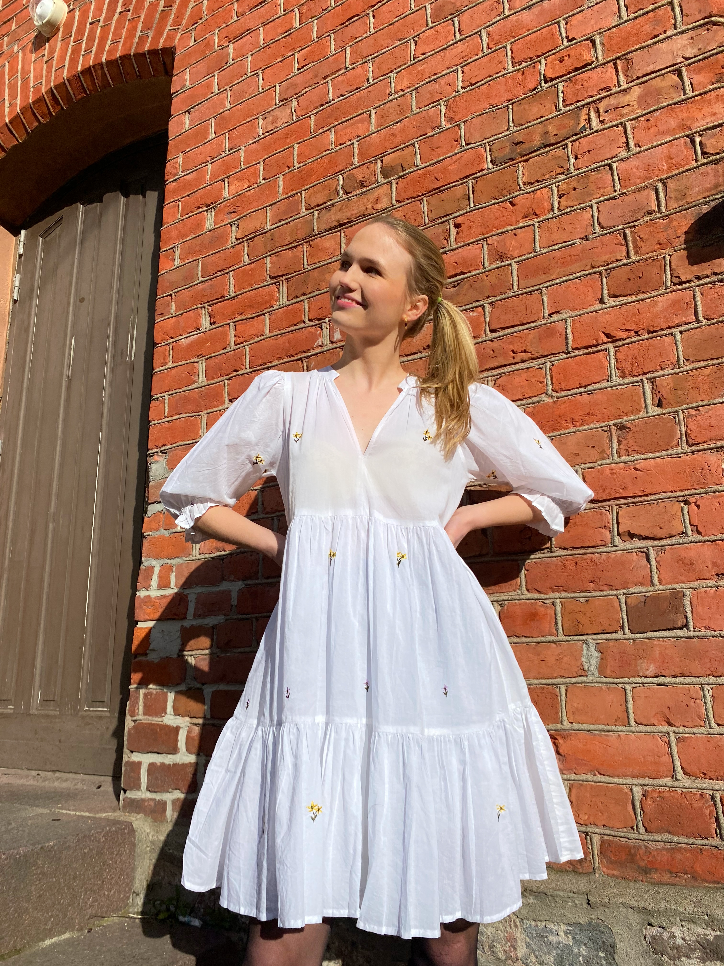 Kort kjolemodell med trendy broderier og lace-detaljer. Kjolen har avskåret midje, romantiske rynkedetaljer, stikklommer og strikk i ryggen for en perfekt passform. Foret skjørt. Løs passform og normal i størrelsen.