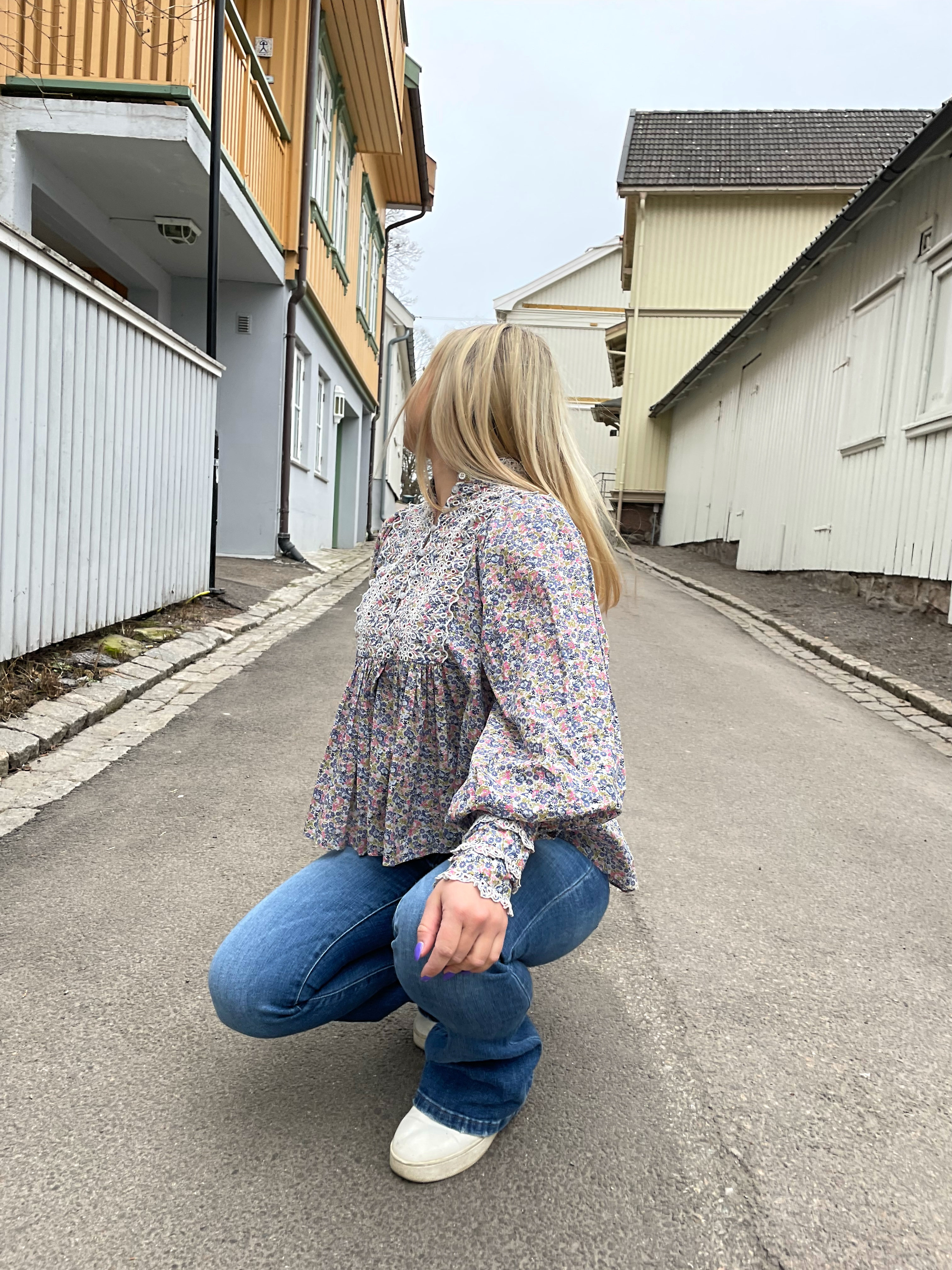 "Cotton Slub Lace Blouse" fra byTiMo. Nydelig blondebluse i en tynn og lett bomullskvalitet. Ermene er oversized. Det er engelske blondedetaljer på ermene og brystet.