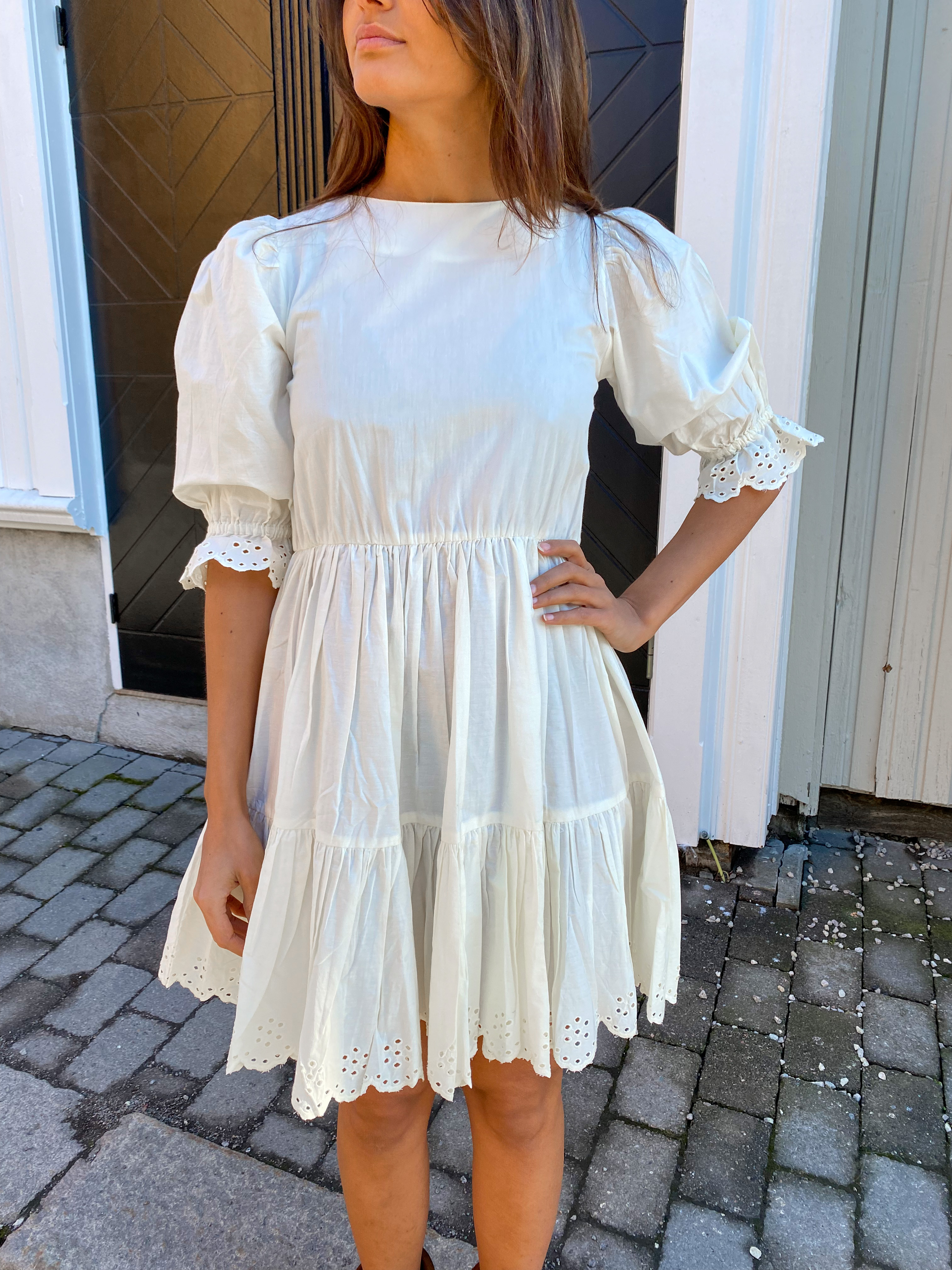«Emilia dress» fra MissMaya er en vakker poplin kjole med broderi anglaise-detaljer. Kjolen har rynkesøm i midjen og strikk i ryggen for perfekte passform. Kjolen har trekvart ermer med lett puff og strikk med volang nederst på erm. Normal i størrelsen.