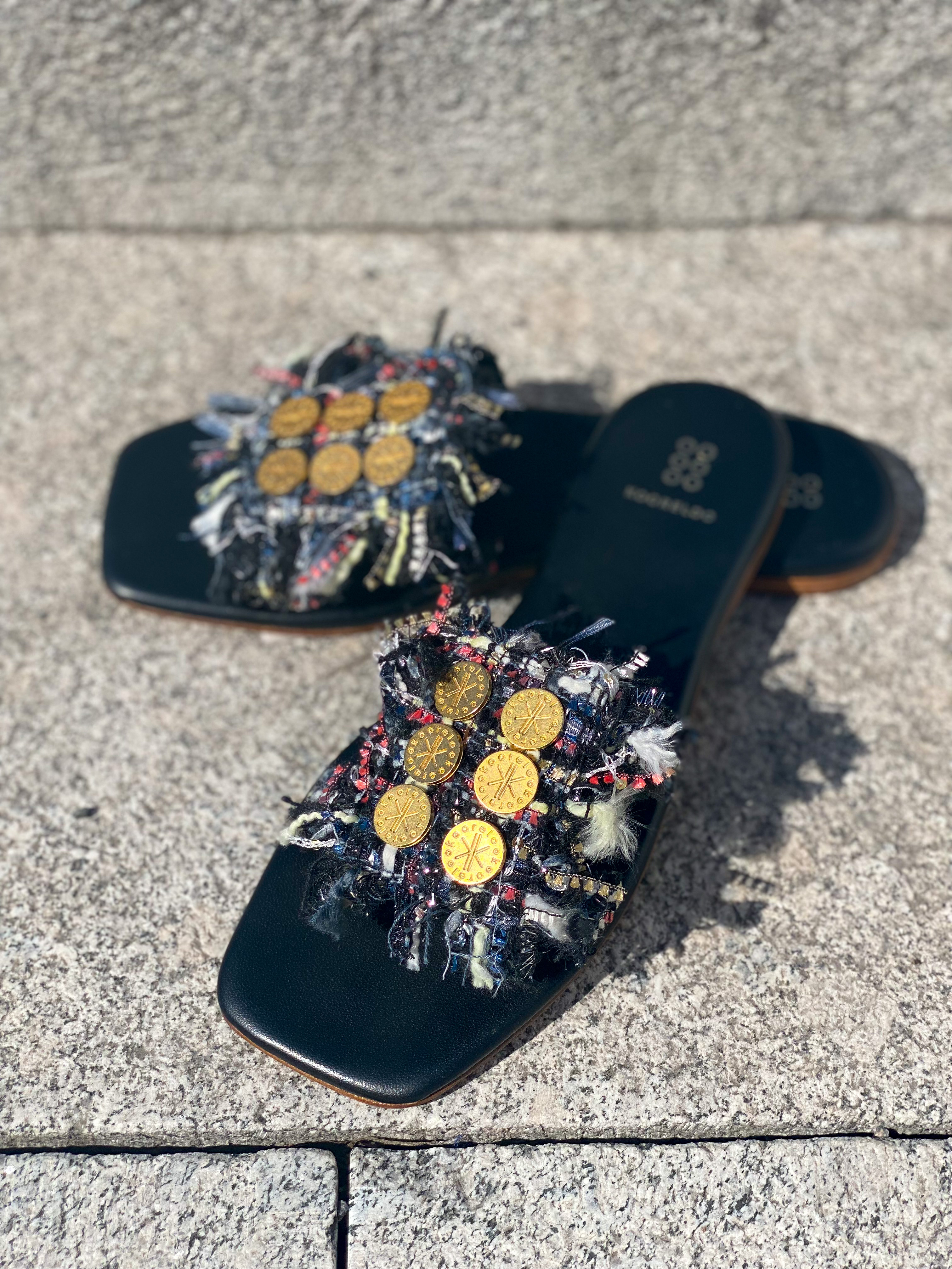 "Alethea Flat Mules" fra Kooreloo er en sandal i tweeted stoff.