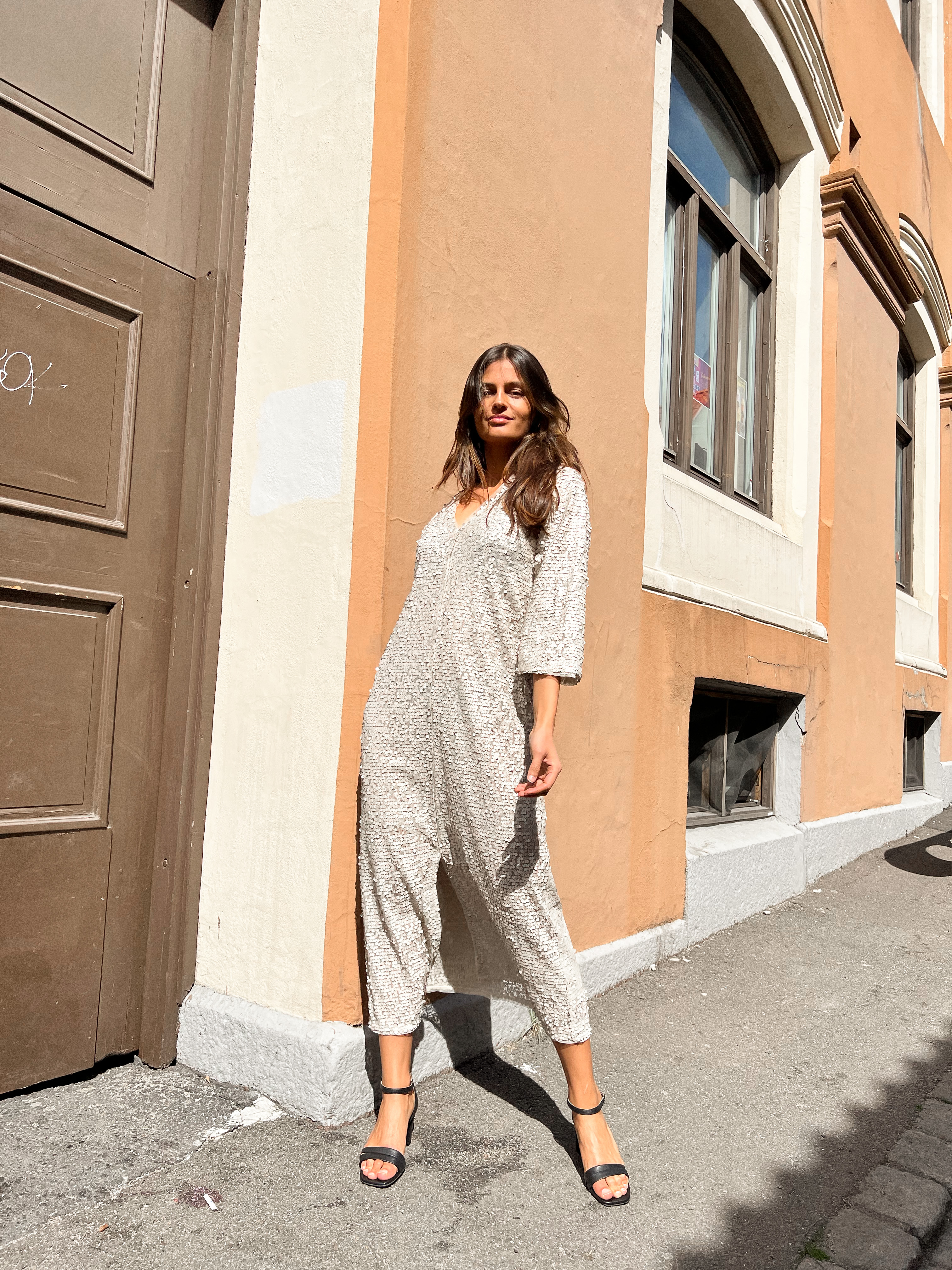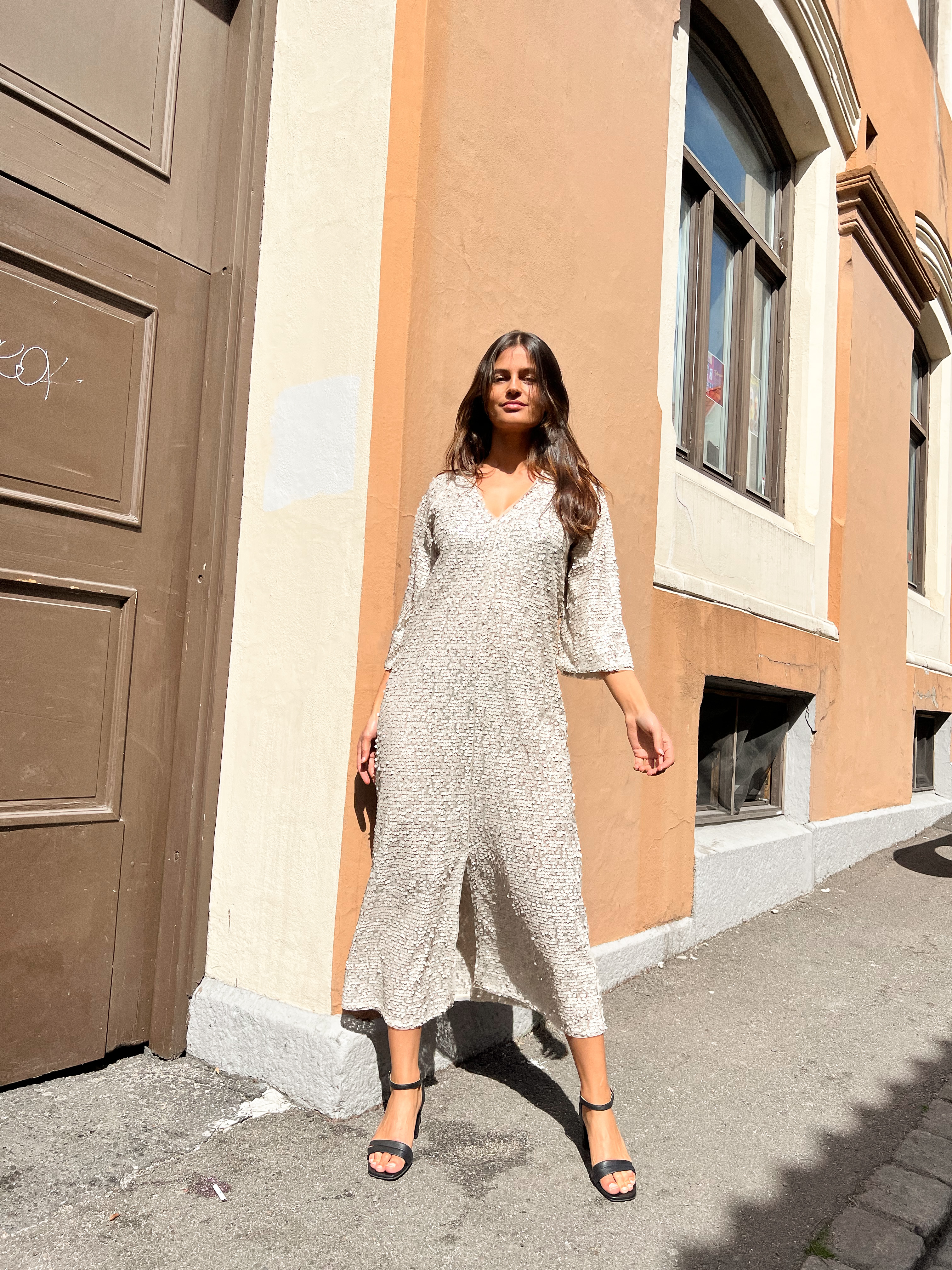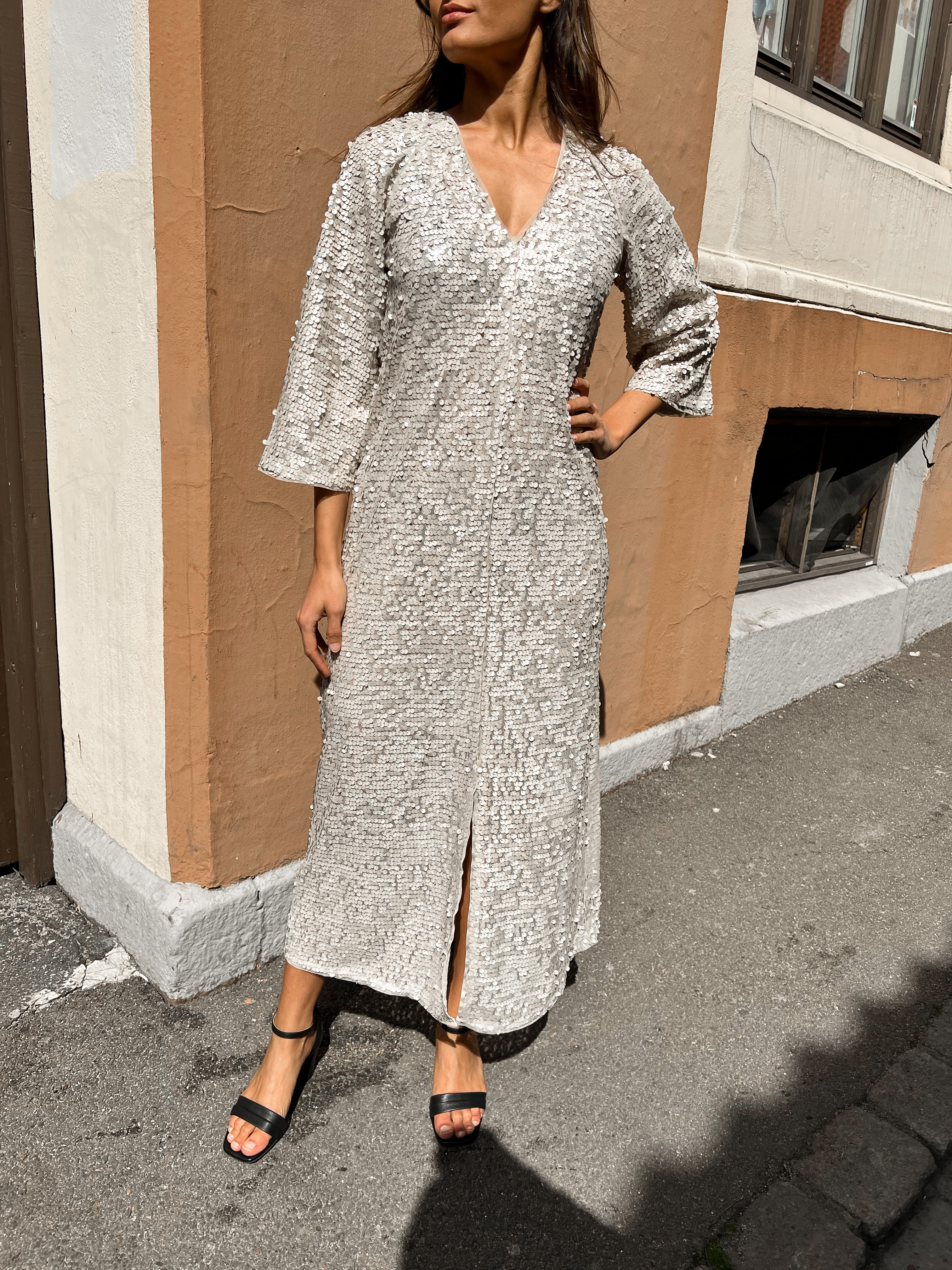«Lifa dress» fra Second Female er en rålekker paljettkjole i champagne. Den har v-hals og halvlange ermer. Normal i størrelsen.