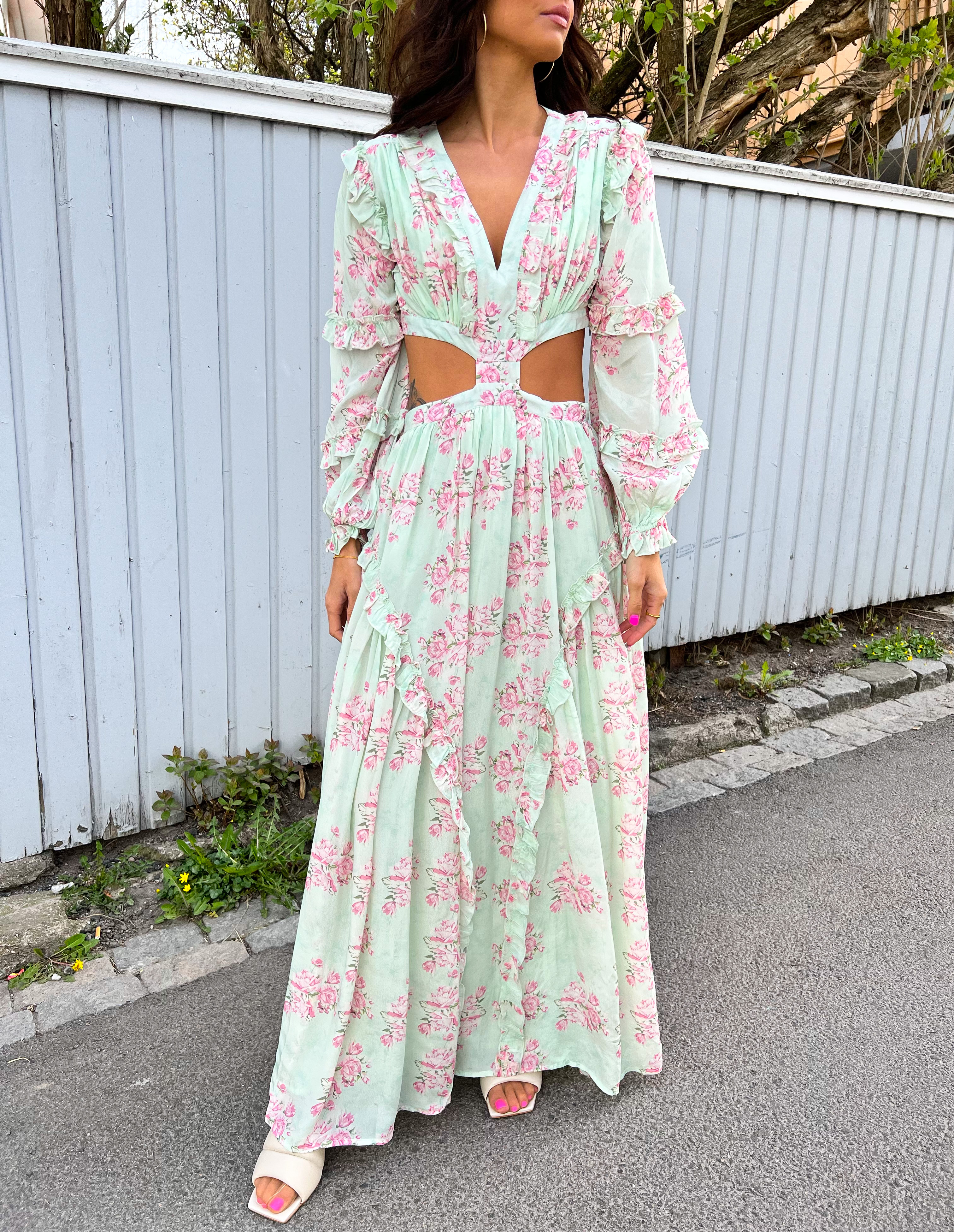 Vakker lang kjole i lekkert print. Den har utskjæringer på alle de riktige stedene, og vi er besatt! Nydelig på! Style den med dine favorittsandaler med hæl! Normal i størrelsen.