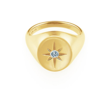 Oval signetring ID Fin logo stjernegravert Klar cubic zirconia i midten. FRorgylt sterlingsølv 22 karat gullbelagt Rhodiumbelagt.