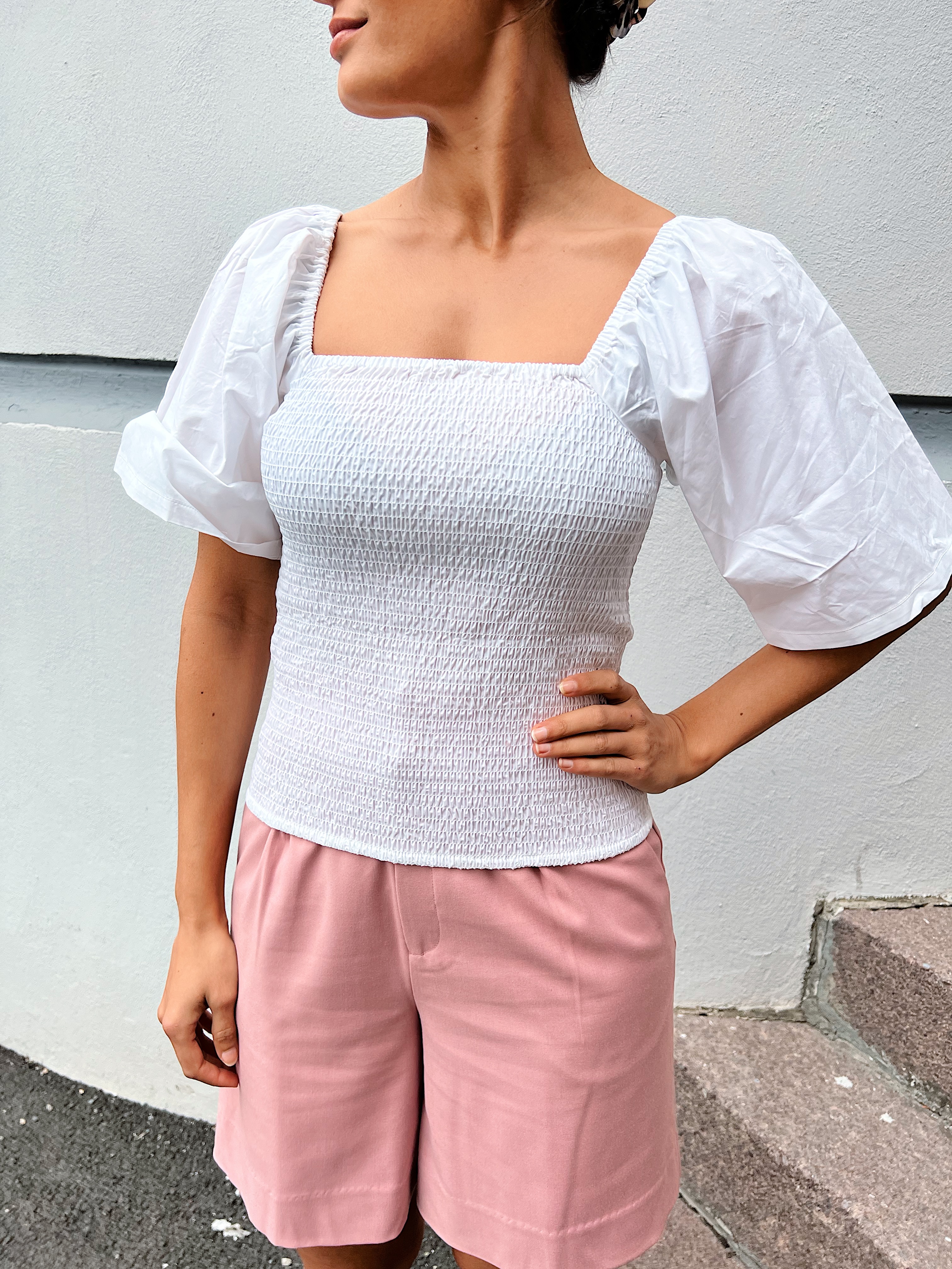 «Josha blouse» fra Gestuz er en nydelig hvit bluse. Blusen har firkantet hals og korte ermer med puffeffekt. Normal i størrelsen.