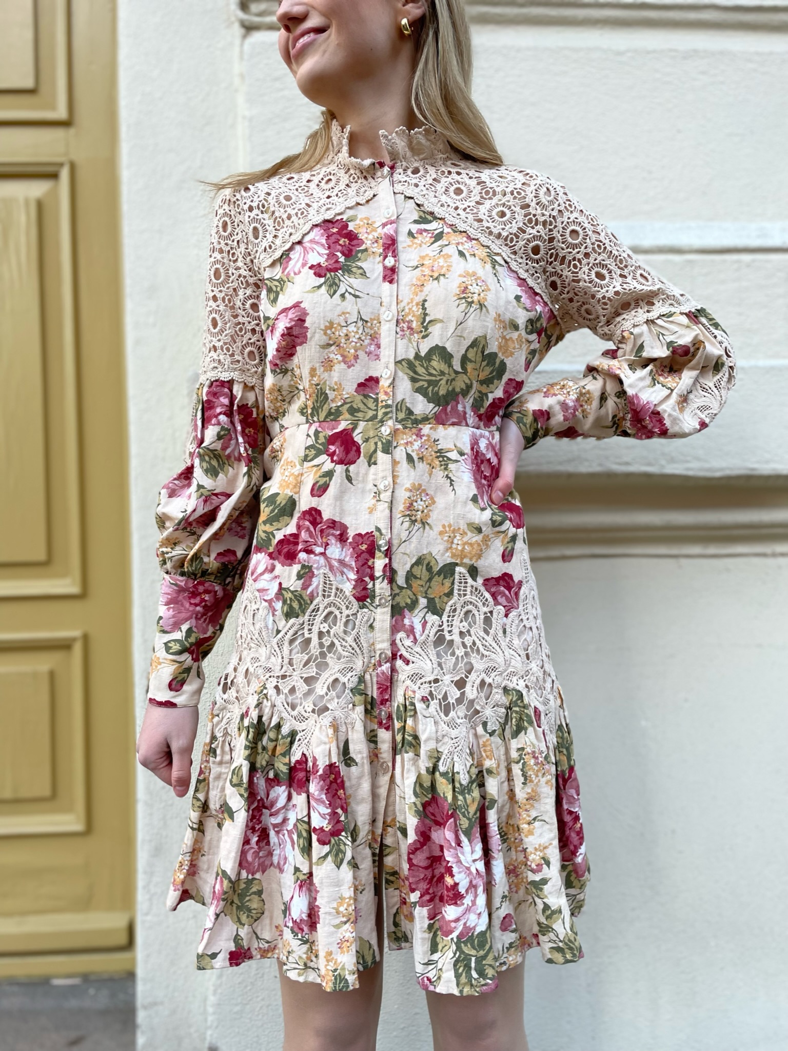 "Linen Mini Dress" fra byTiMo. Nydelig kjole i en eksklusiv lin- og bomullskvalitet og håndlagde broderier. Knepping foran og på ermene. Perfekt snitt rett under brystet.
