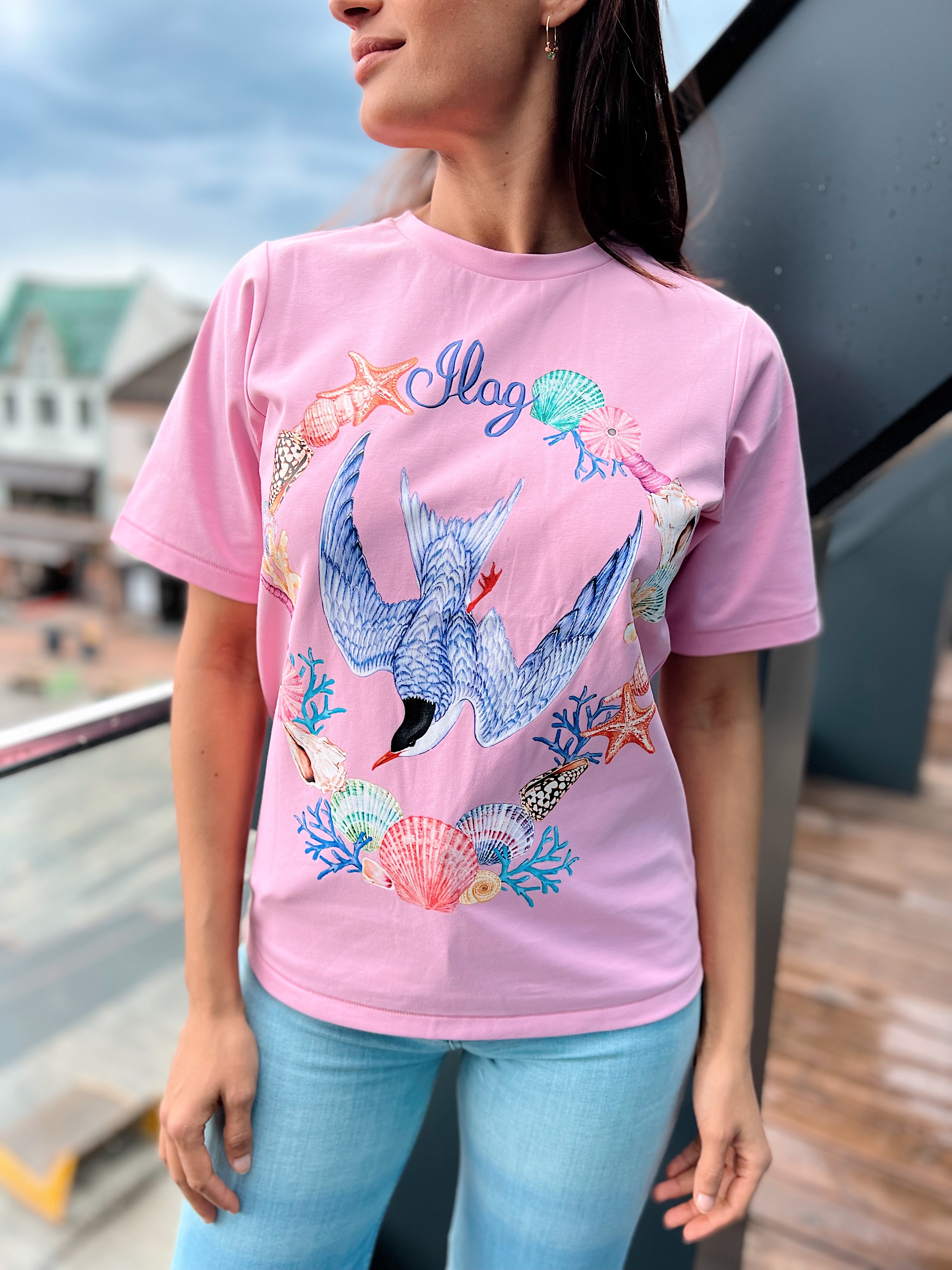 "Løvmeis tee" fra ILAG er en nydelig t-skjorte i avslappet fasong med håndtegnet print av Stephanie LeCocq.