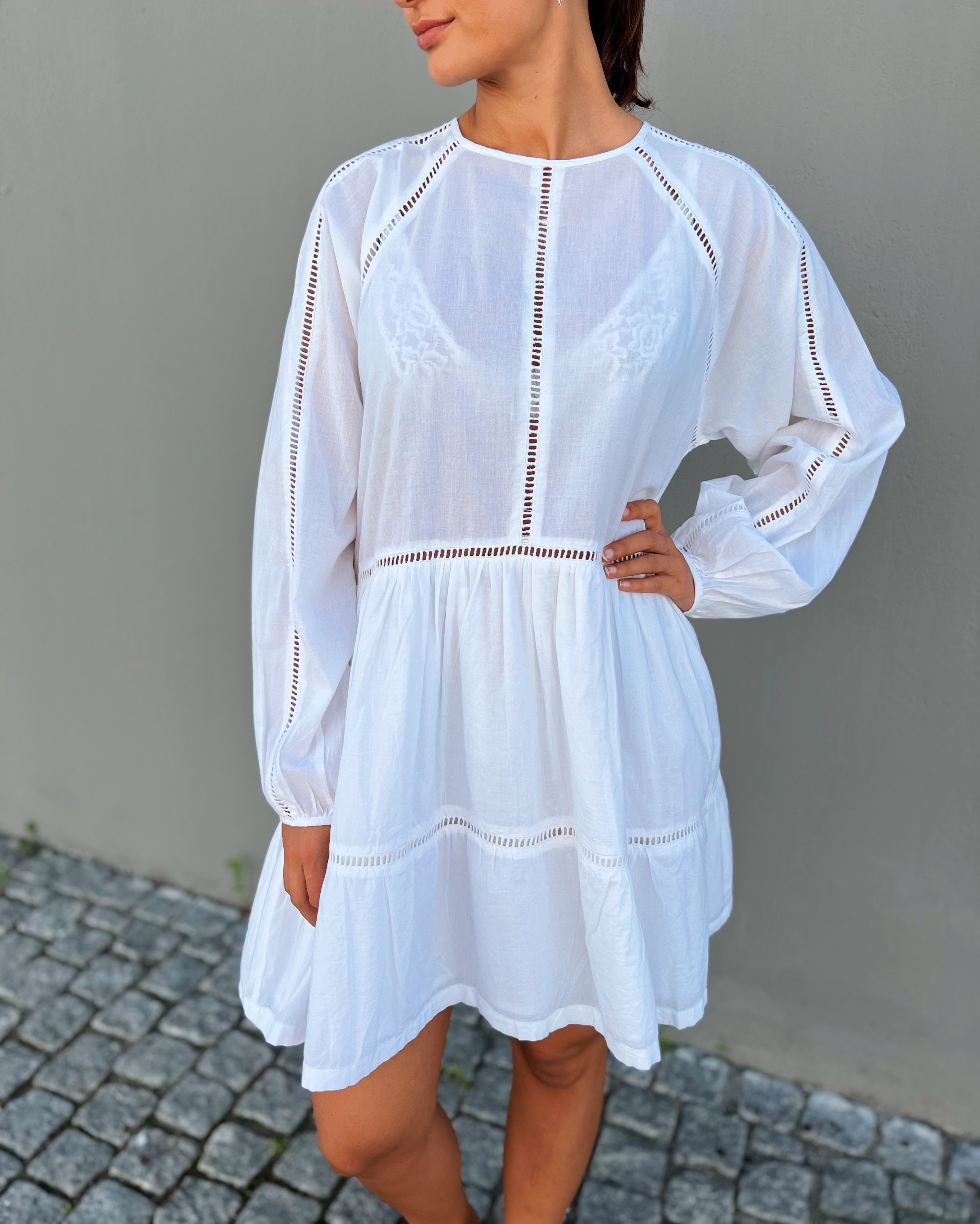 «Vel dress» fra norske merke Iben er en nydelig minikjole med lekre detaljer. Kjolen har rund hals, lang erm og liten åpning bak med knyting. Volangkant nederst på skjørtet. Løs passform og normal i størrelsen.