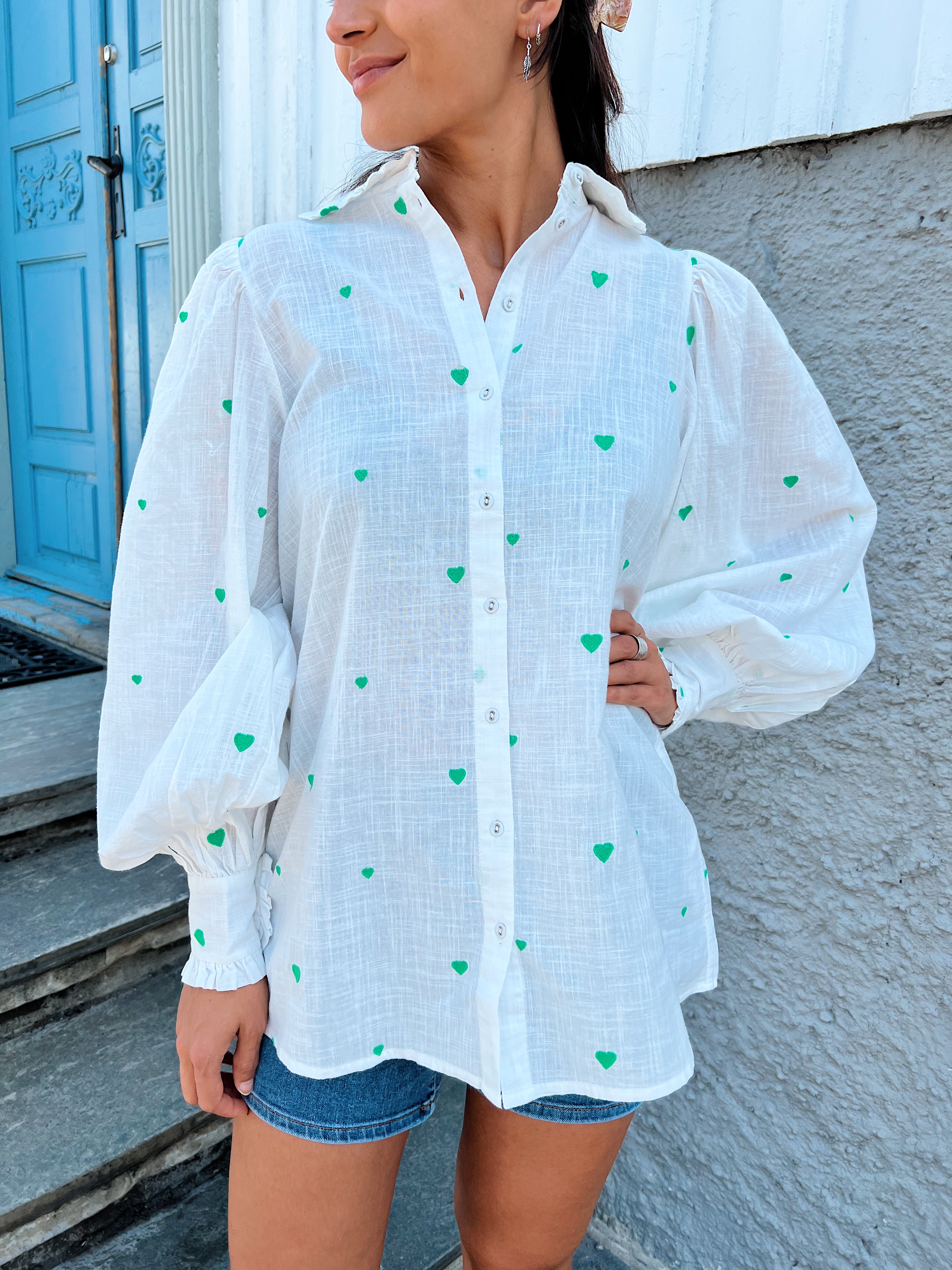 «Heart shirt tunic» fra Yas er en oversized hvit skjorte med grønne hjerter. Skjorten har krage, lang erm og lukkes med knapper. Oversized og normal i størrelsen.