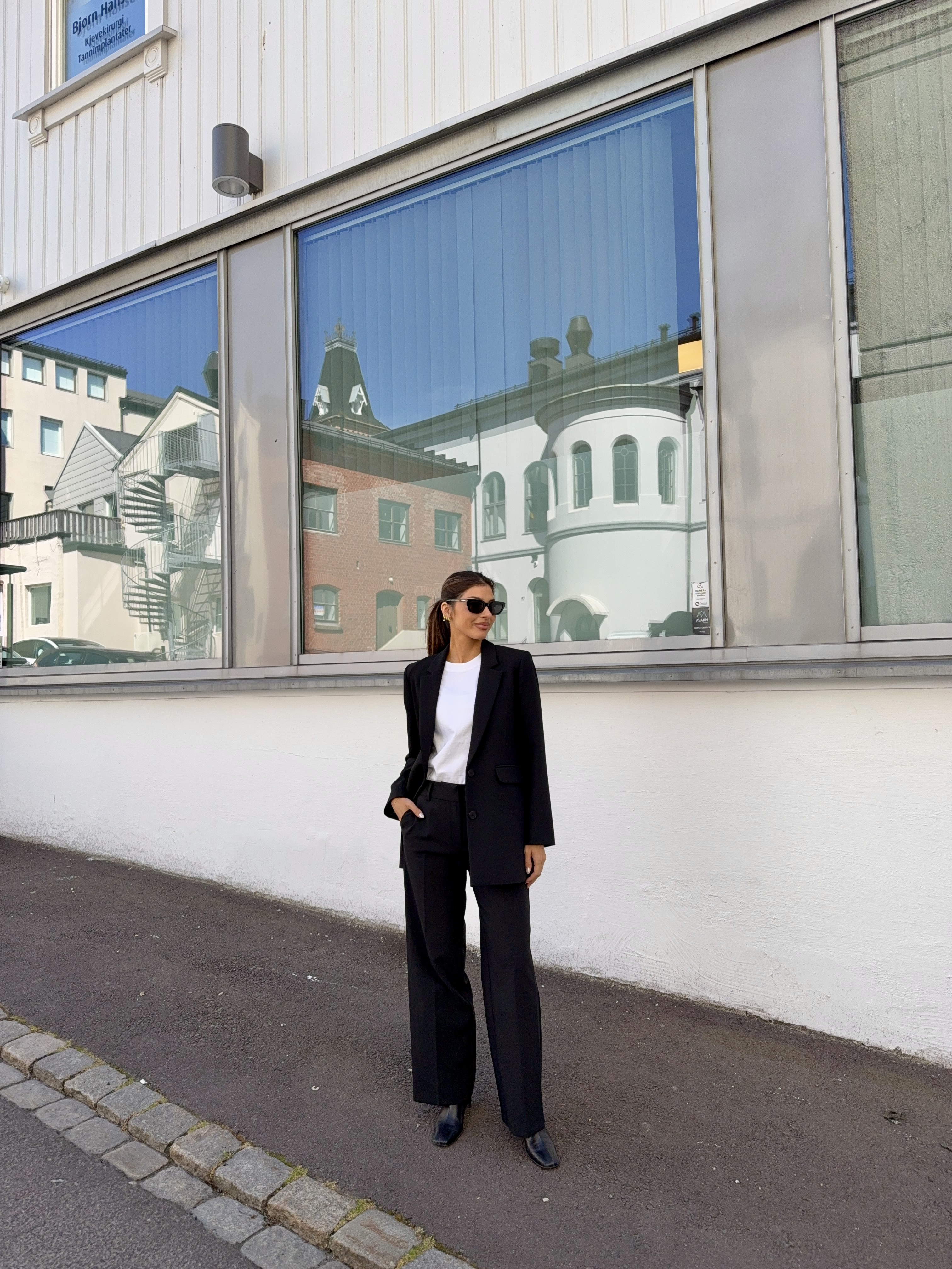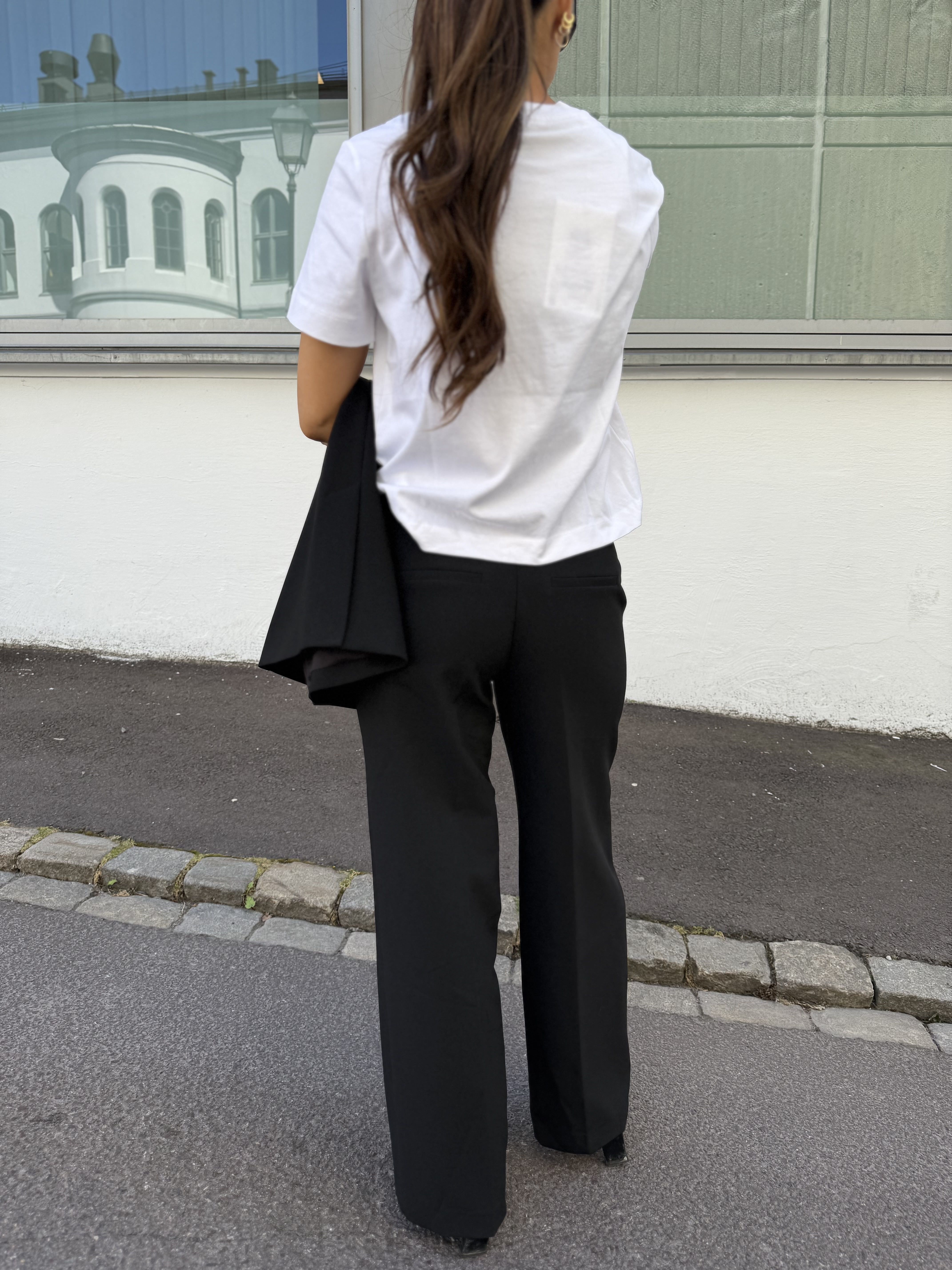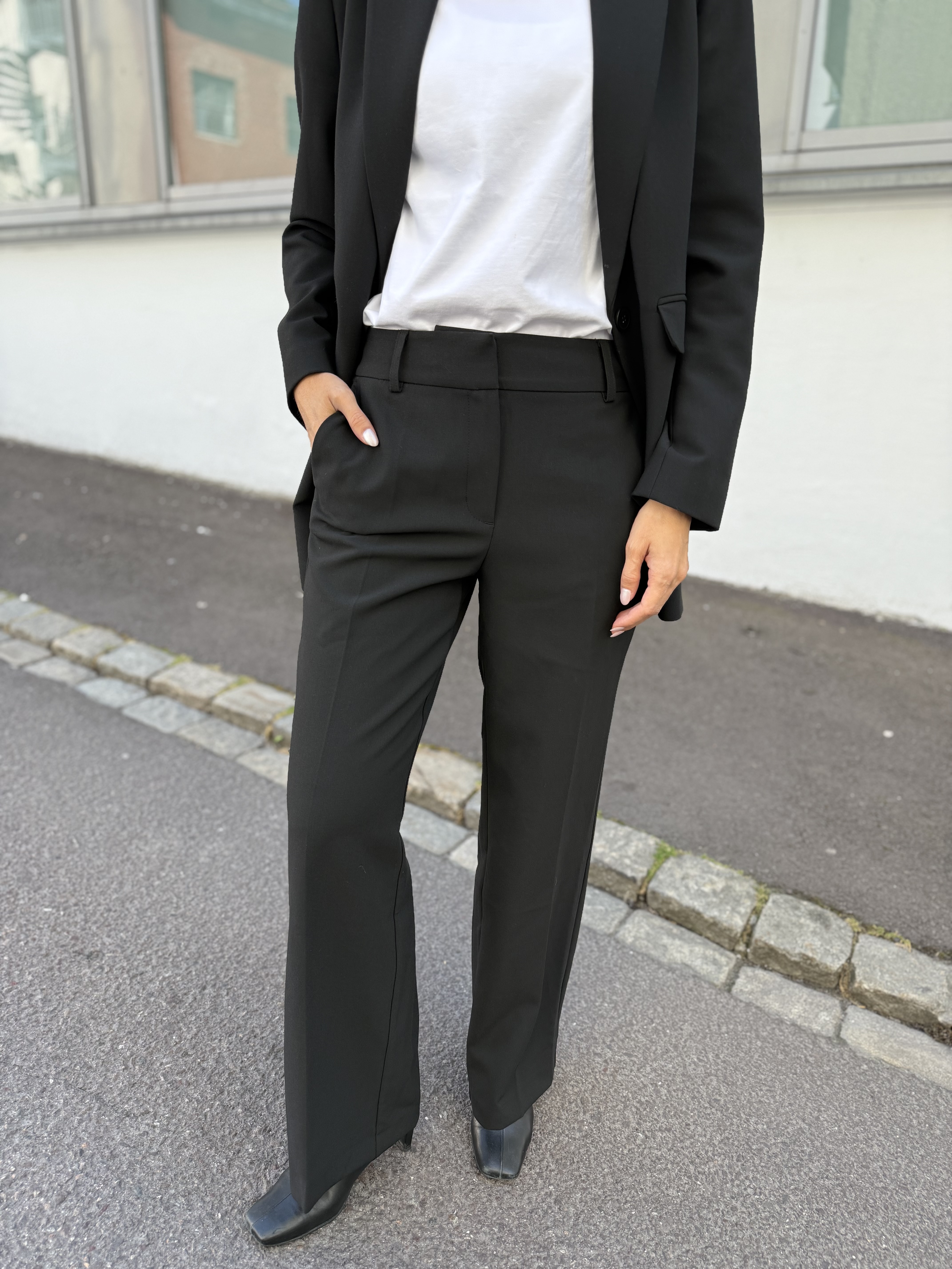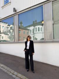 "Rita wide pant" fra Selected Femme er en klassisk sort dressbukse som passer til alt. Kan pyntes med en lekker bluse eller like fint med en strikkegenser. Den sitter over rumpe og lår, mens den er løs i beina. Buksen har to lommer foran og har beltestropper.