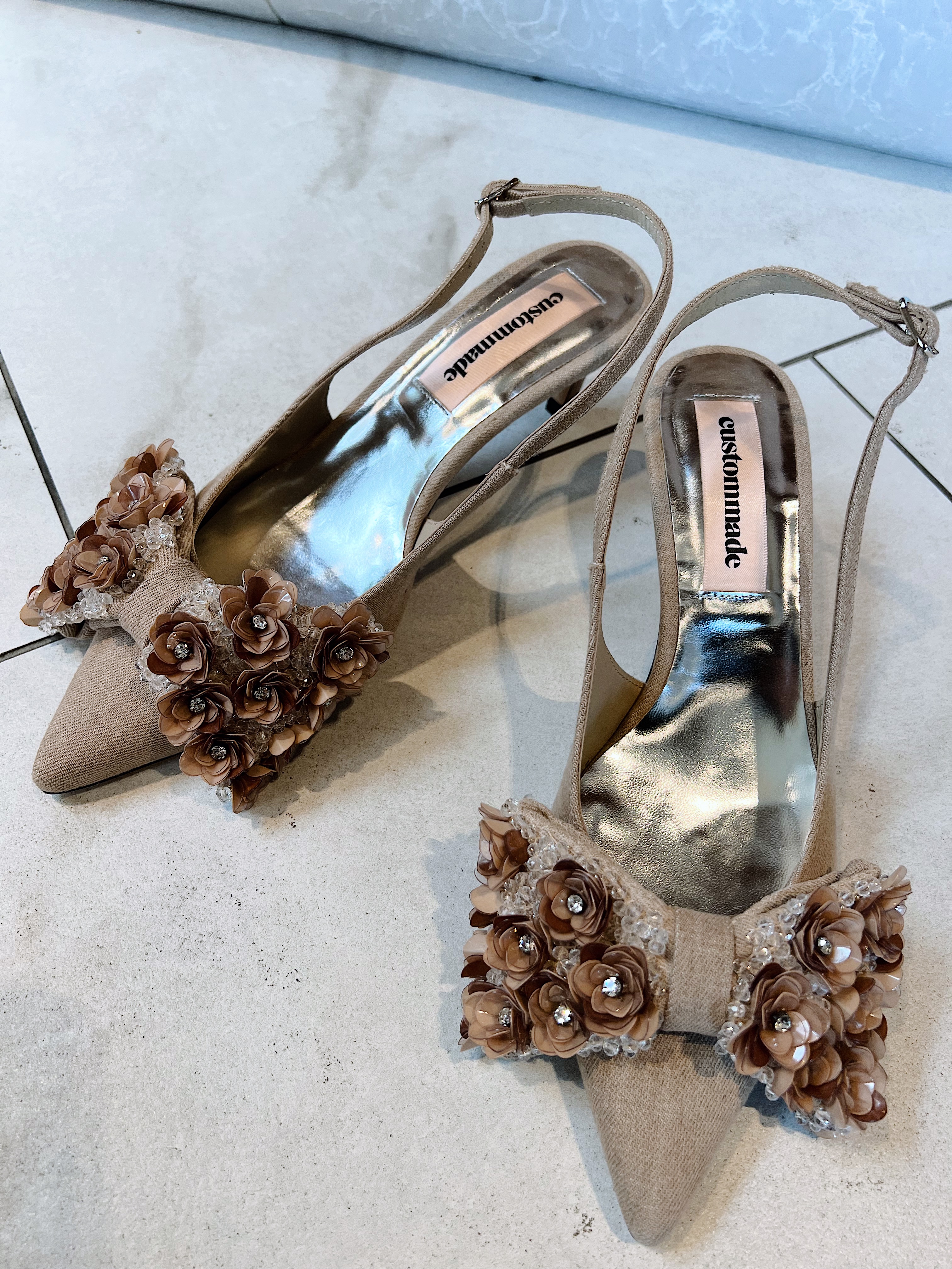 "Alima pearl" fra CUSTOMMADE rålekre pensko, Skoen kommer med blomsterdekor i front og har en behagelig passform. Det er den perfekte festskoen med 6 cm hæl. Den er normal i størrelsen. Håndlaget i Portugal.