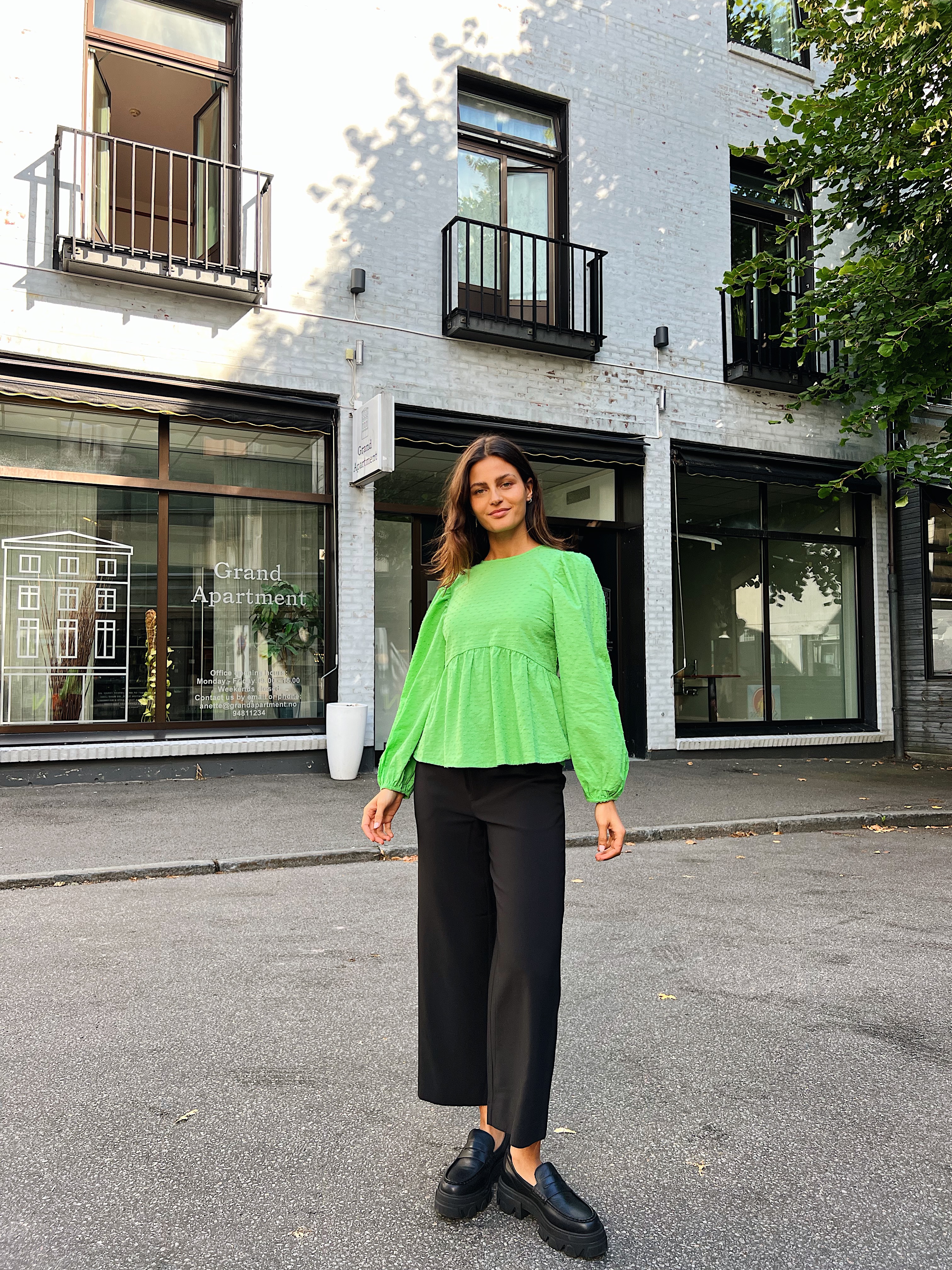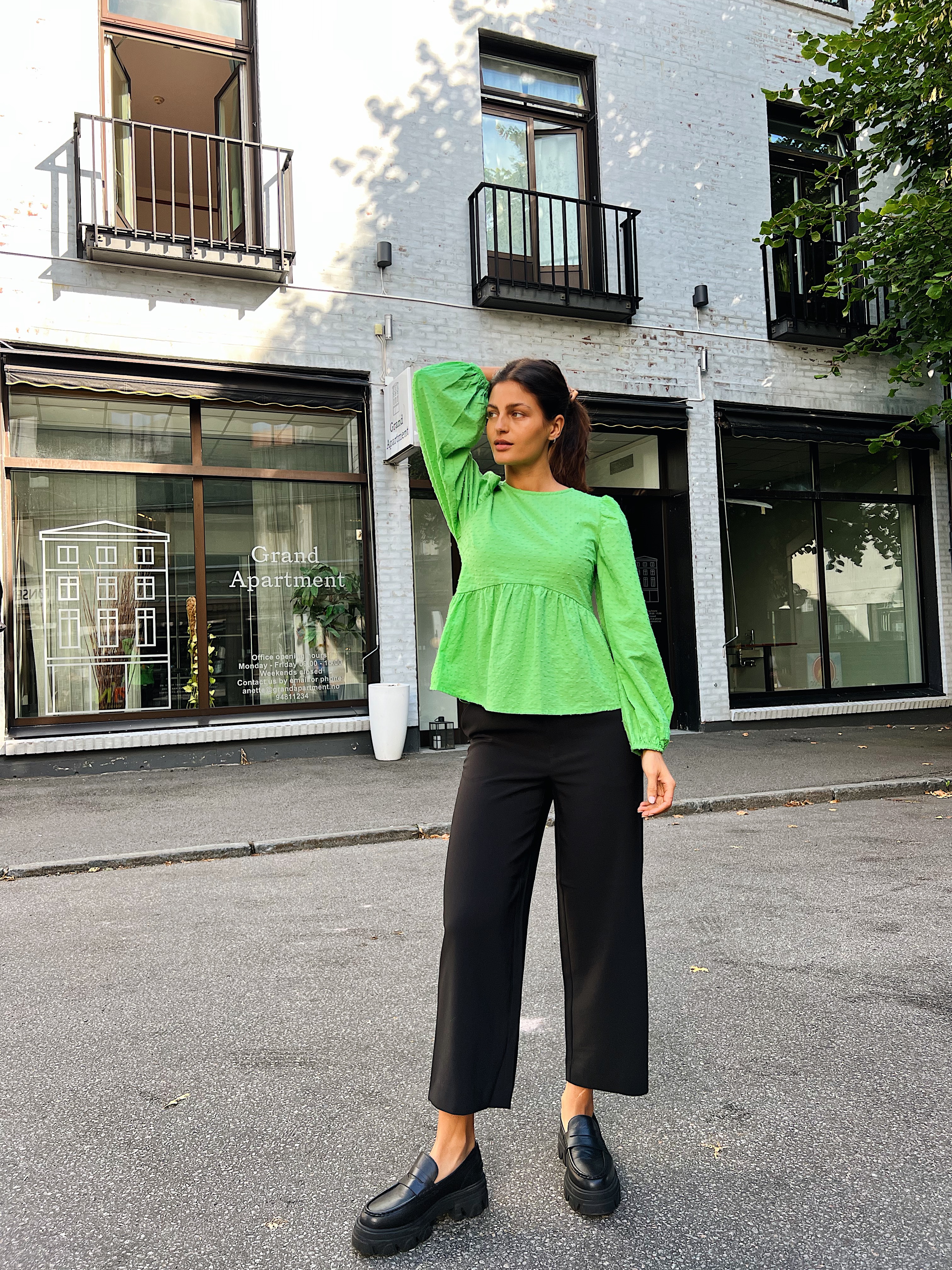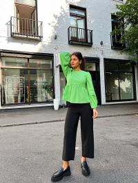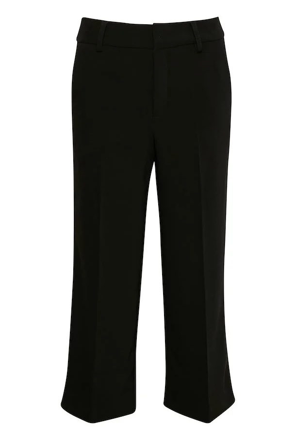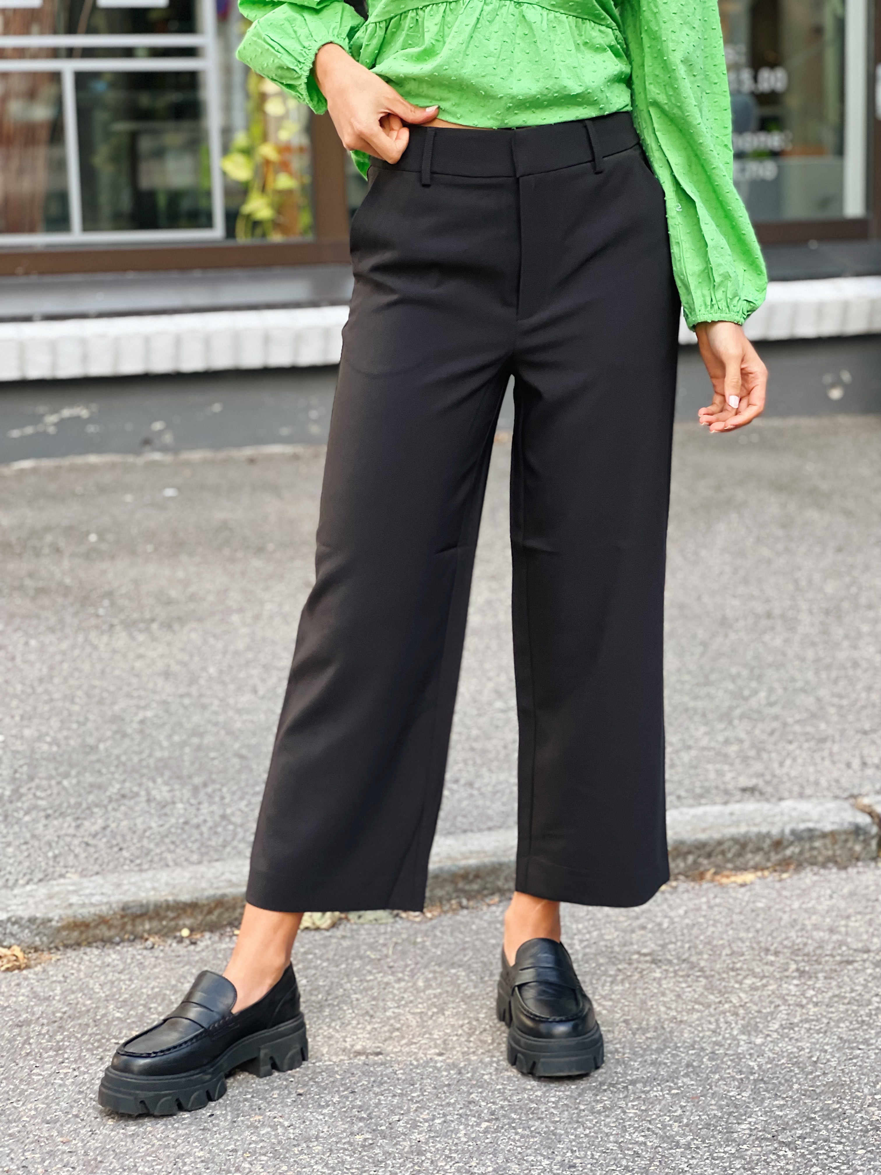 «Joelle culotte» fra Gestuz. Klassisk sort dressbukse med vie rette ben i ankel lengde. Den er høy i midjen og lommer på siden. Normal i størrelsen.