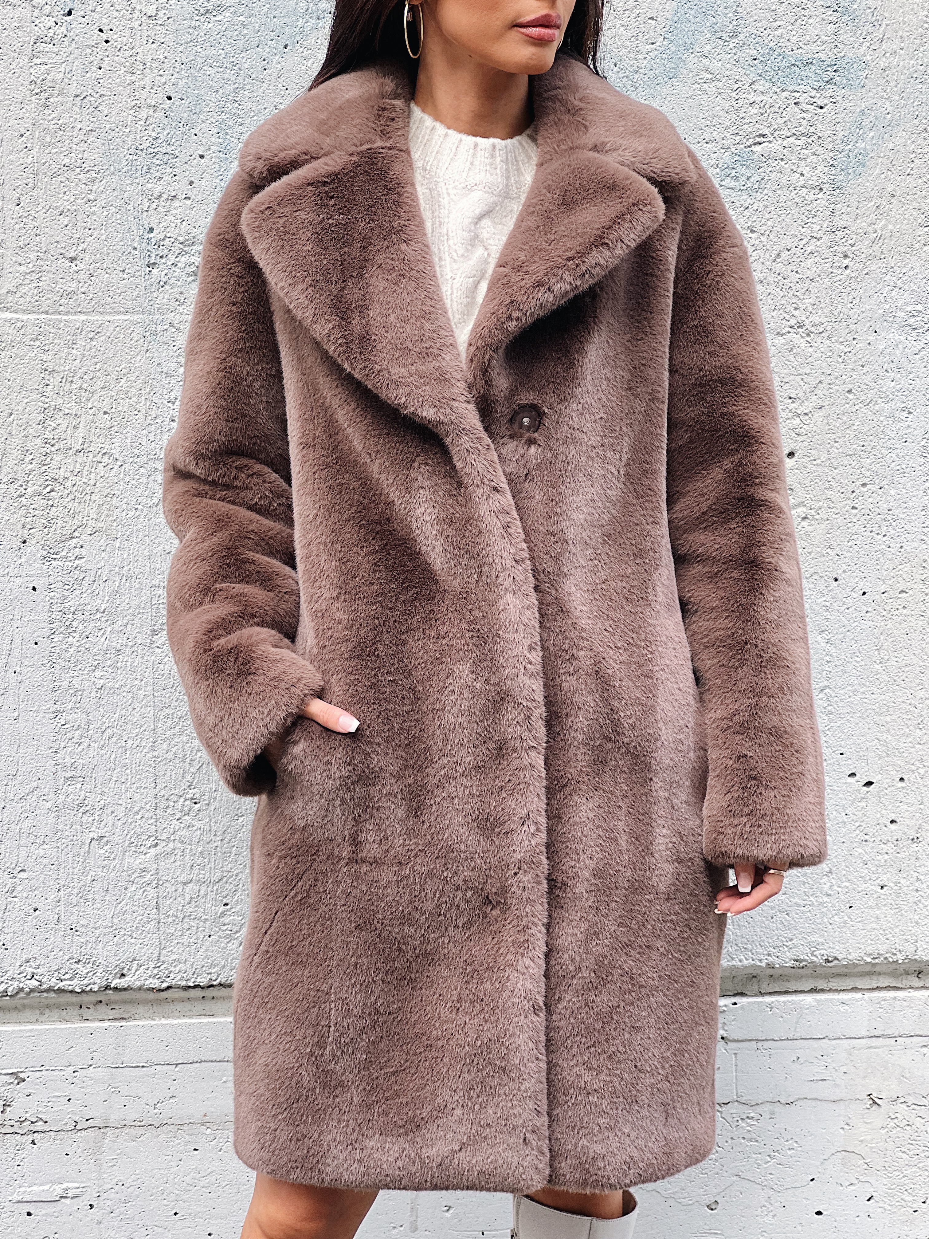 «Camille cocoon coat» fra Stand Studio er det perfekte ytterlaget for å holde deg varm og koselig i de kaldere dager. Den er laget av overdådig myk fuskepels og avskåret for en avslappet passform som vil passe godt over tykke strikkevarer. Den har lommer på siden. Jakken er midi-lengde i modellen og normal i størrelsen.
