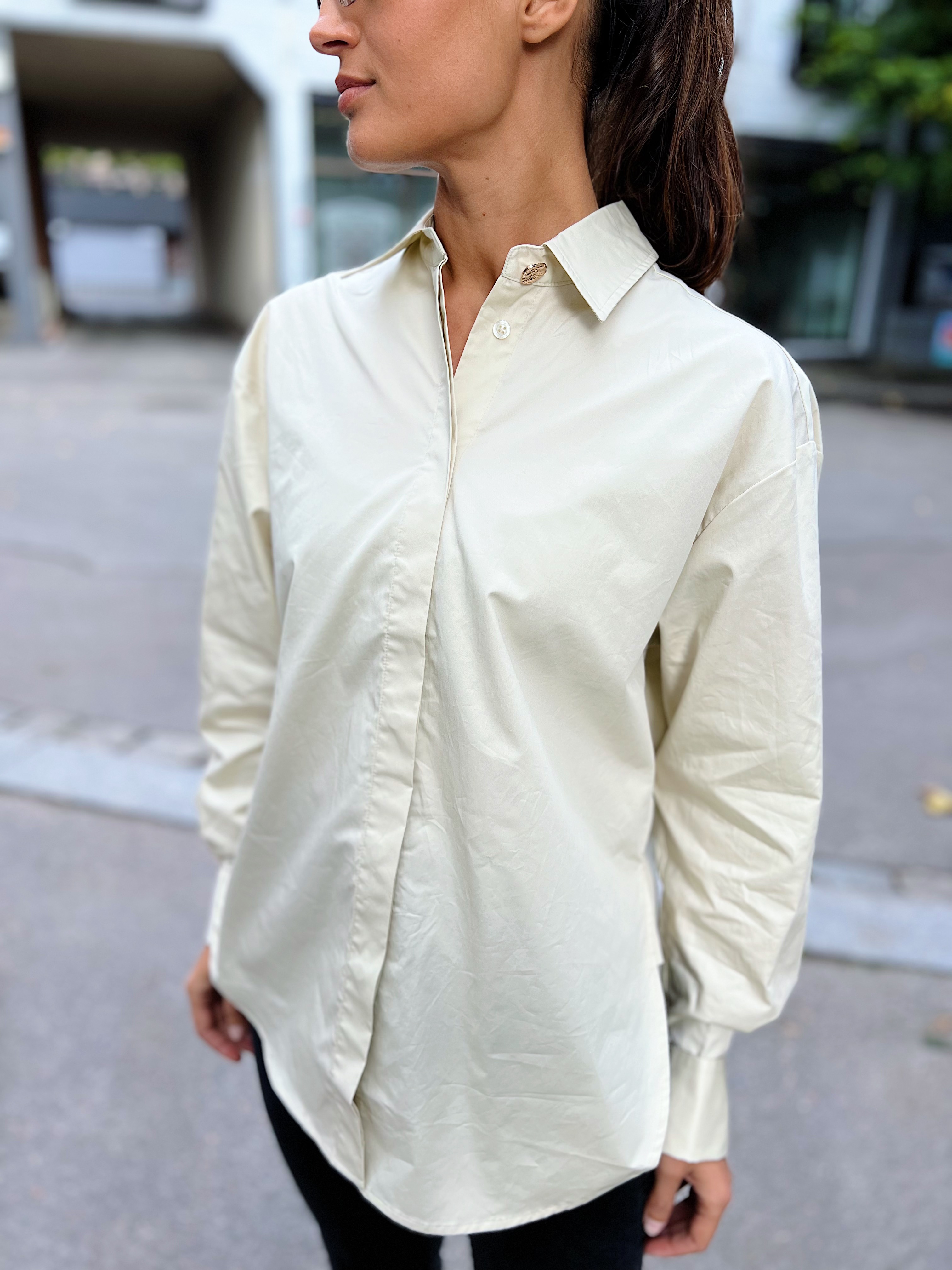 «Occasion shirt» fra Second Female. Klassisk skjorte med krage og lang erm. Lukkes med knapper. Ene knapper er krystall knapp som gir den lille ekstra detaljen. Normal i størrelsen.