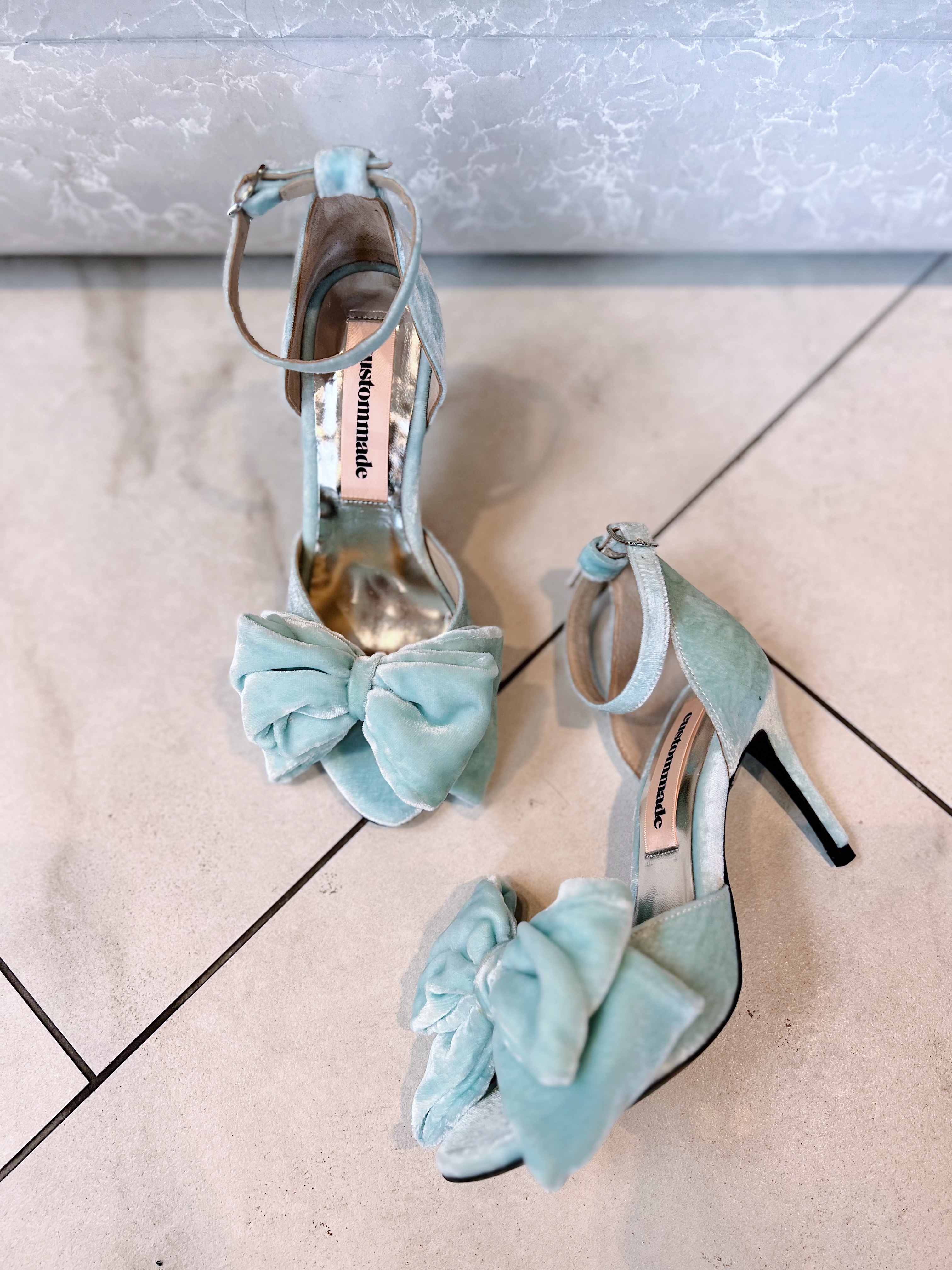 "Marita velvet" fra Custommade Lekre pensandaler i blank «Deep Lavender» fløyel. Skoene har åpen tå og stor sløyfe foran. Regulerbar reim over ankelen og stiletthæl. Hælhøyde 8,5 cm.