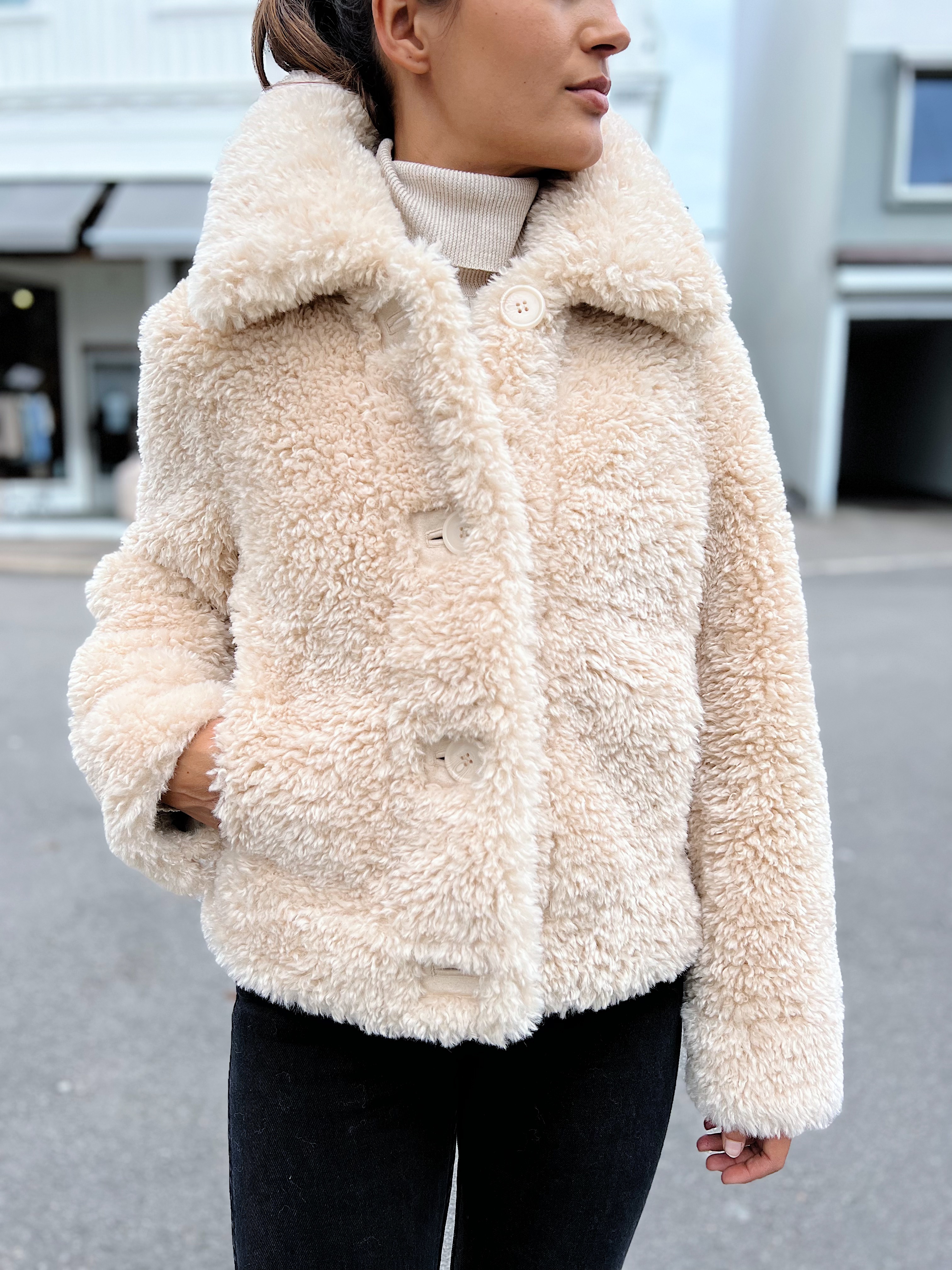 «Melina jacket» fra Stand Studio. Nydelig «Teddy jakke» i farge «sand». Jakken har krage, lang erm og lukkes med knapper. Kort i modellen og normal i størrelsen.
