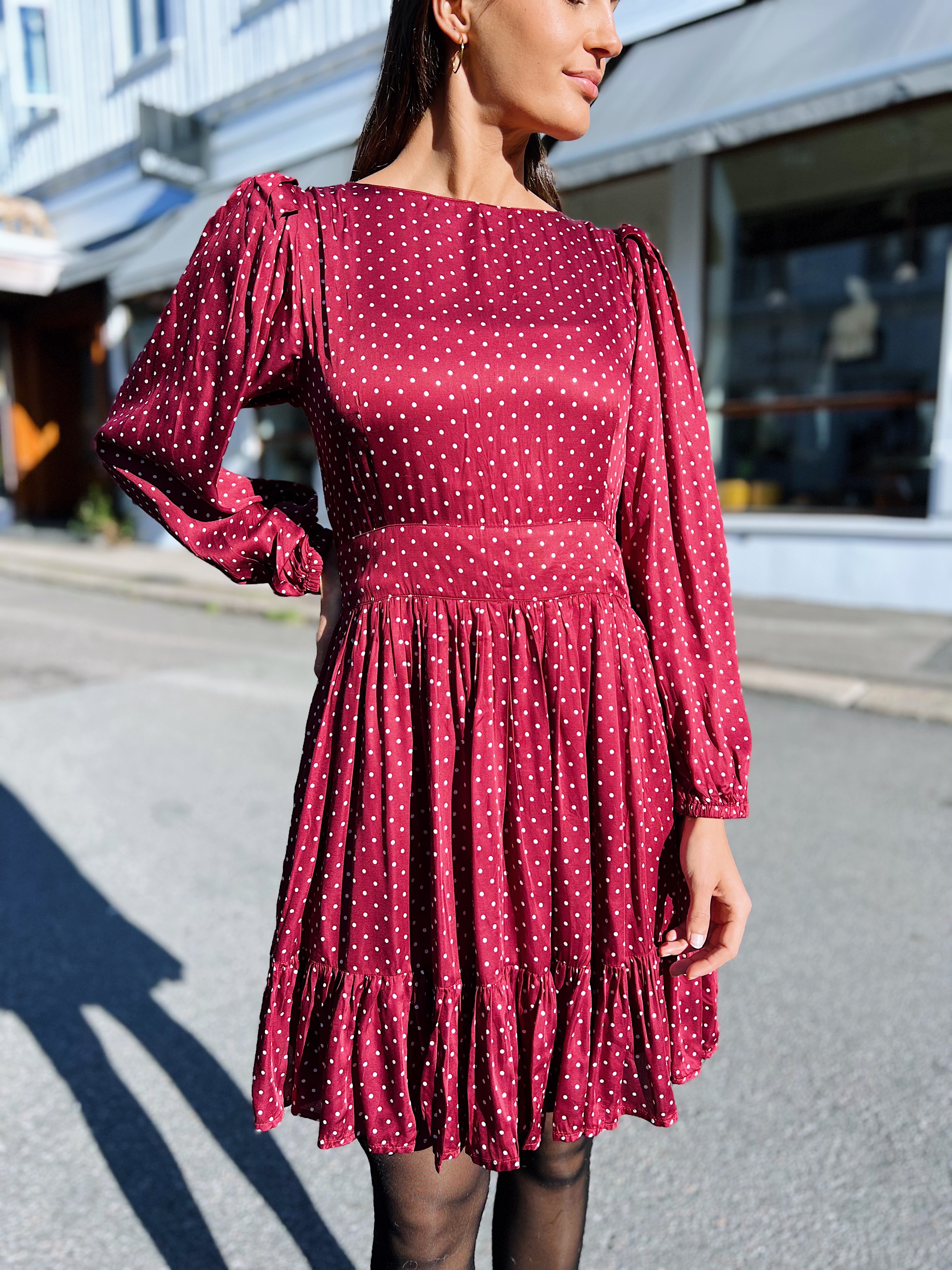 «Rosie dress» fra MissMaya. Superfin kjole. Rosie Dress har en veldig flatterende passform og en nydelig rødfarge. Puffermer med strikk og frill nederst på kjolen. Glidelås bak på rygg. Normal i størrelsen.